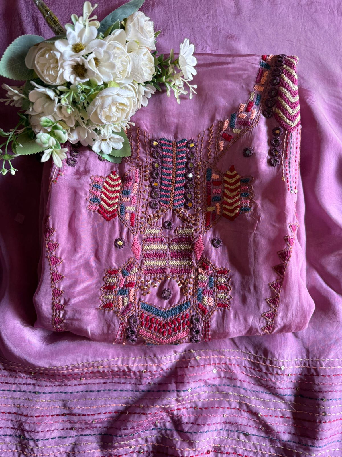 The neckline is beautifully made with Intricate and colorful embroidery in pink, fuchsia, white, blue, and gold threads.