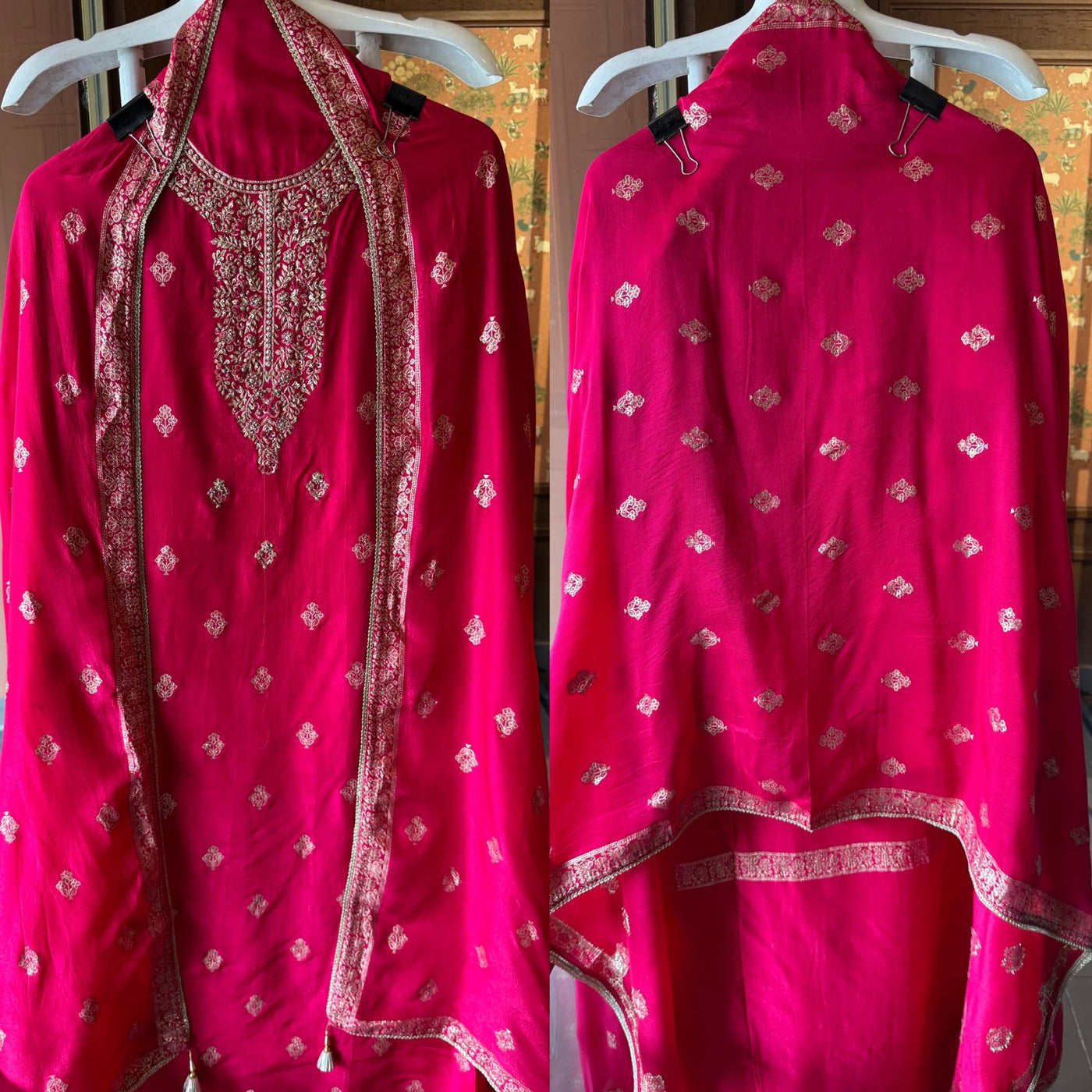Pure silk full size dupatta with four sides gold weaved border and Zari booties all over the dupatta.