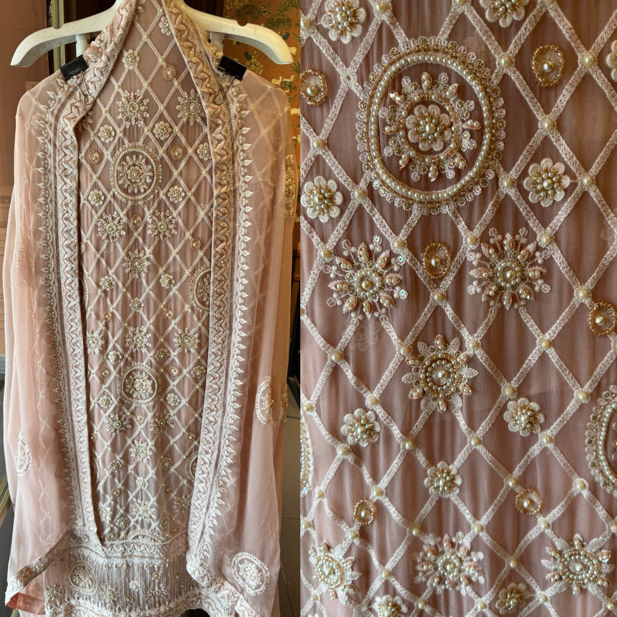 The entire front features an intricate geometric jaal (lattice) pattern created with fine thread embroidery. Each intersection is highlighted with delicate pearl, bead and sequin handwork. Large circular and floral motifs are l handcrafted, giving the outfit a regal and luxurious feel.