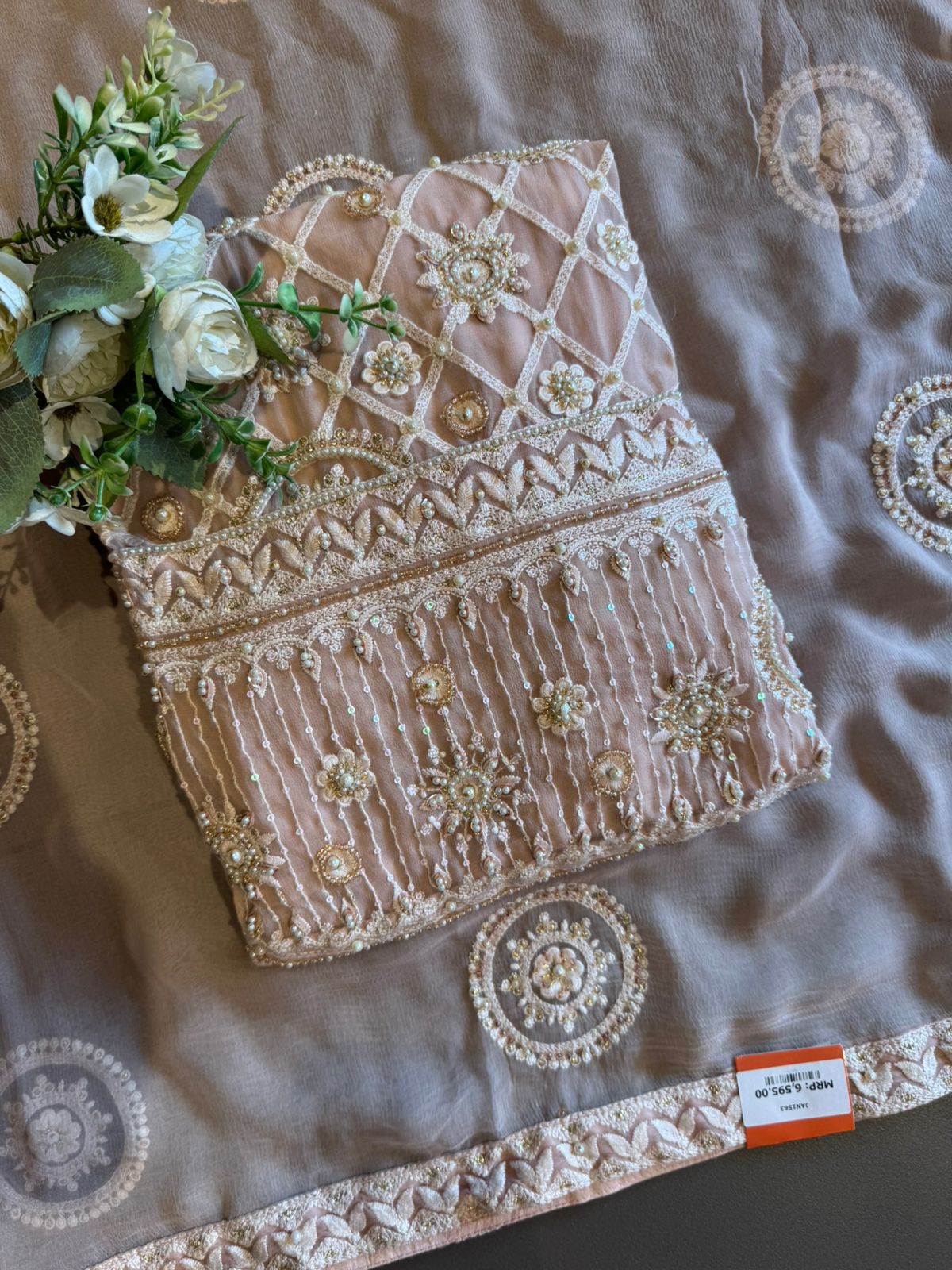 Premium Georgette base in a rich colour , giving a soft fall with a subtle sheen.