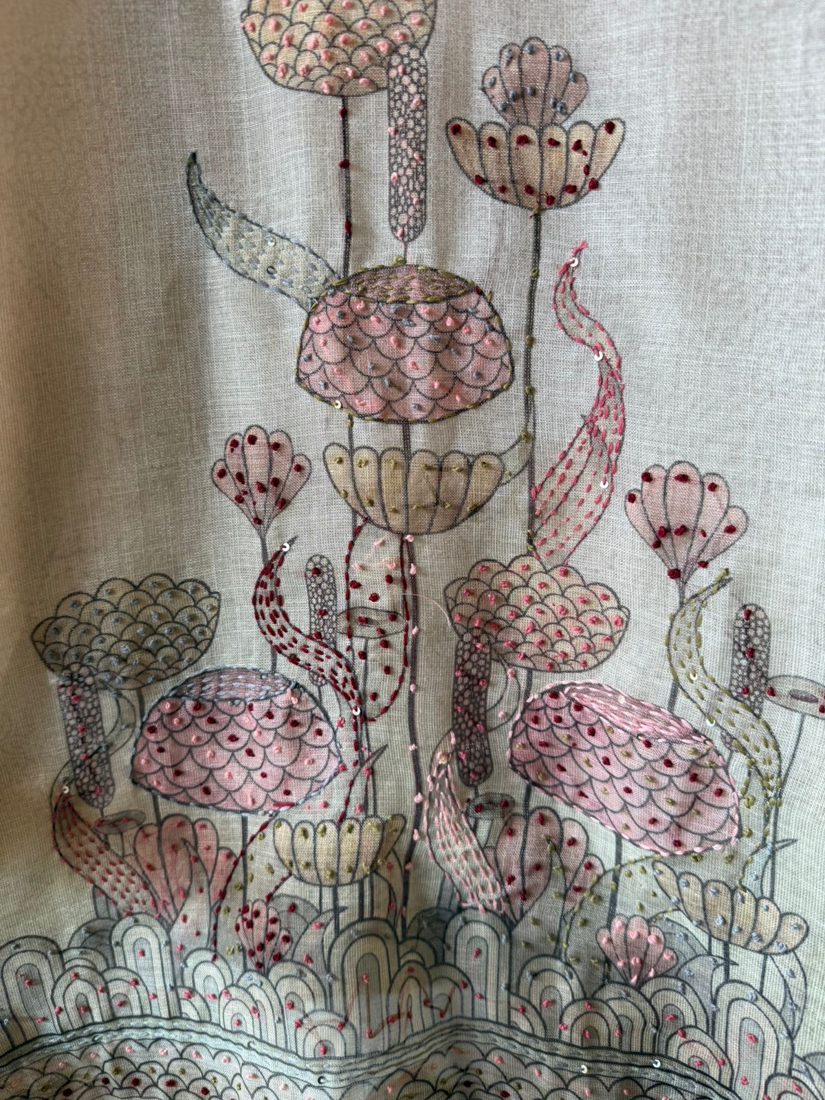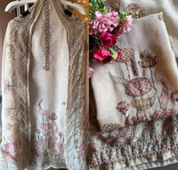 The Linen tissue dupatta has a broad embroidered border with floral patterns in multicolor threads (pinks, greens, Grey, peach).