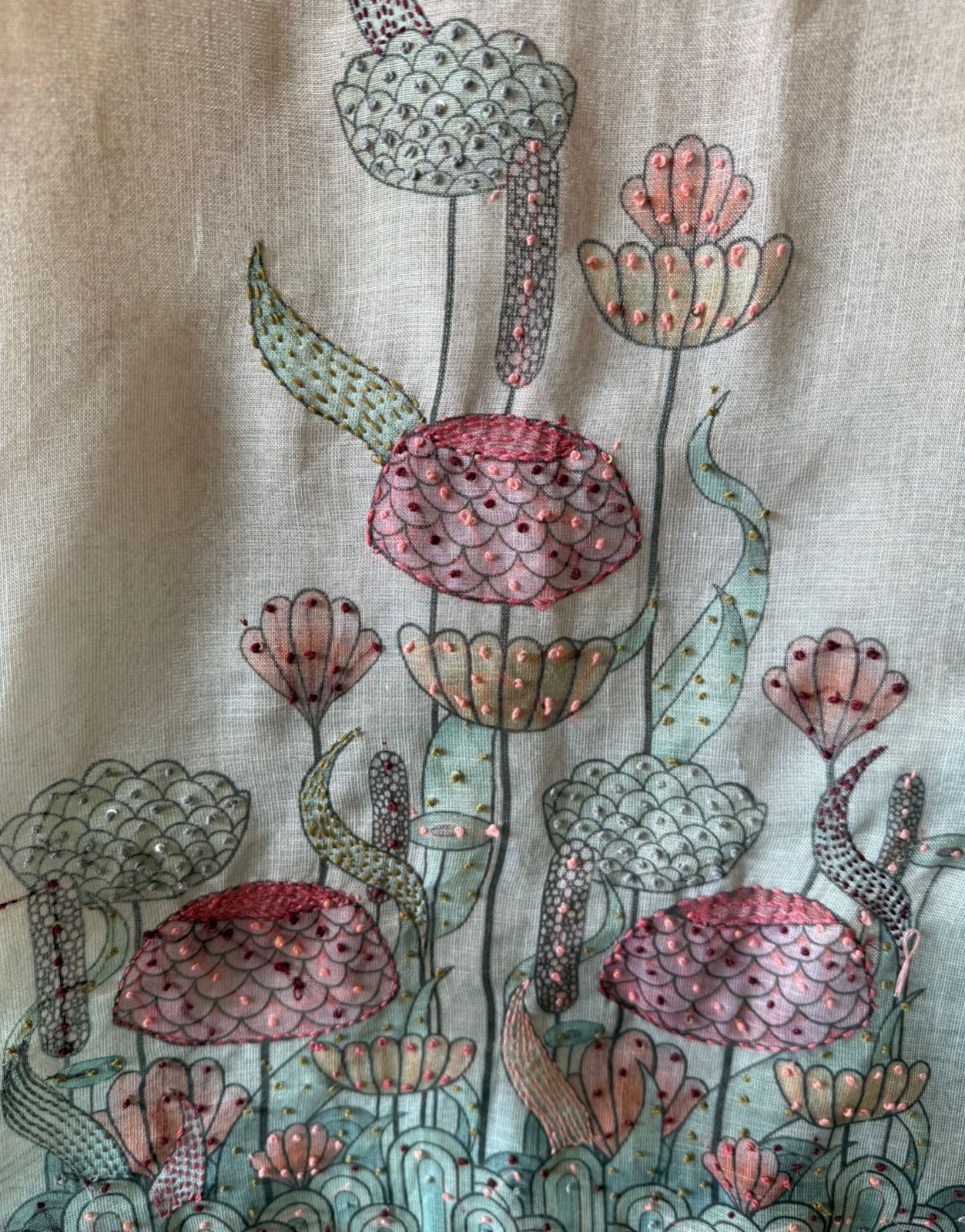 The Linen tissue dupatta has a broad embroidered border with floral patterns in multicolor threads (pinks, greens, Grey, peach).