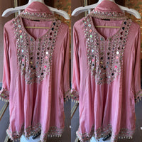 Intricate mirror work (shisha embroidery) arranged in geometric and floral patterns, mainly along the neckline, borders, sleeves, and hemline.