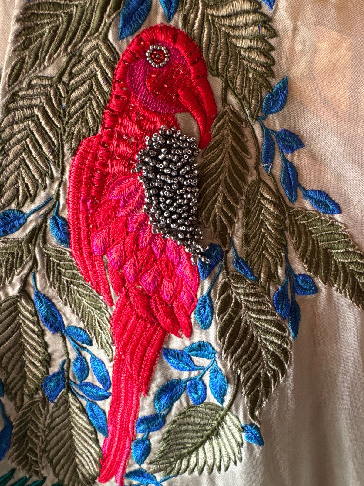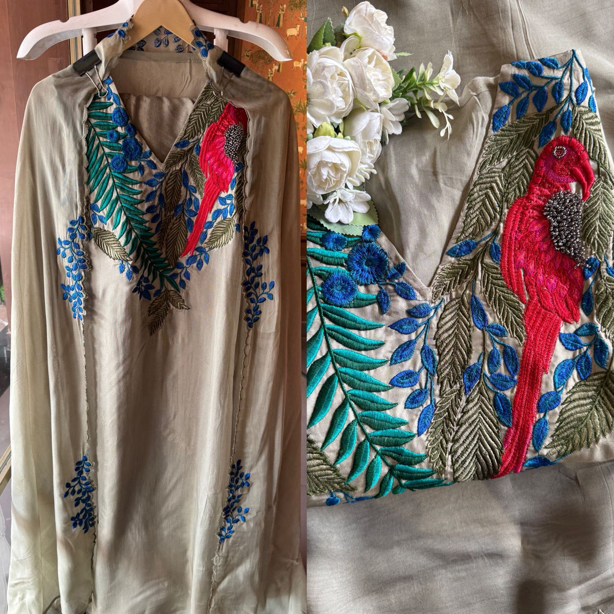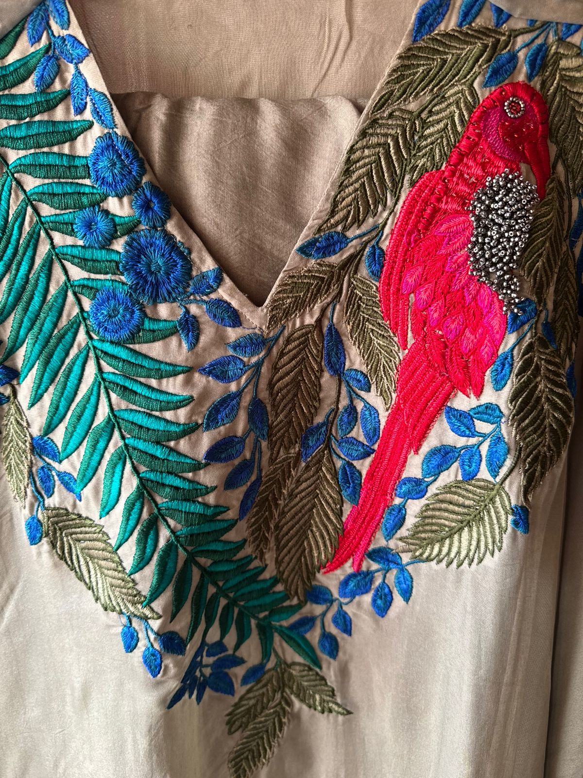 Overall, this design gives a tropical yet elegant look, combining the bold parrot with traditional floral embroidery. It can be styled as a party-wear kurta or long kameez, especially suitable for evening occasions.