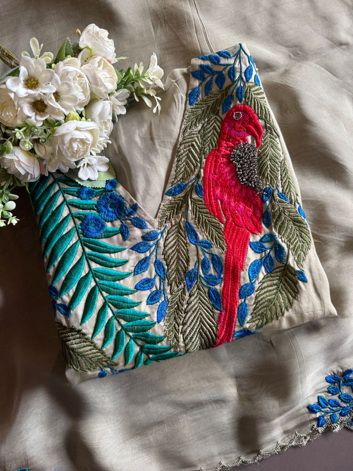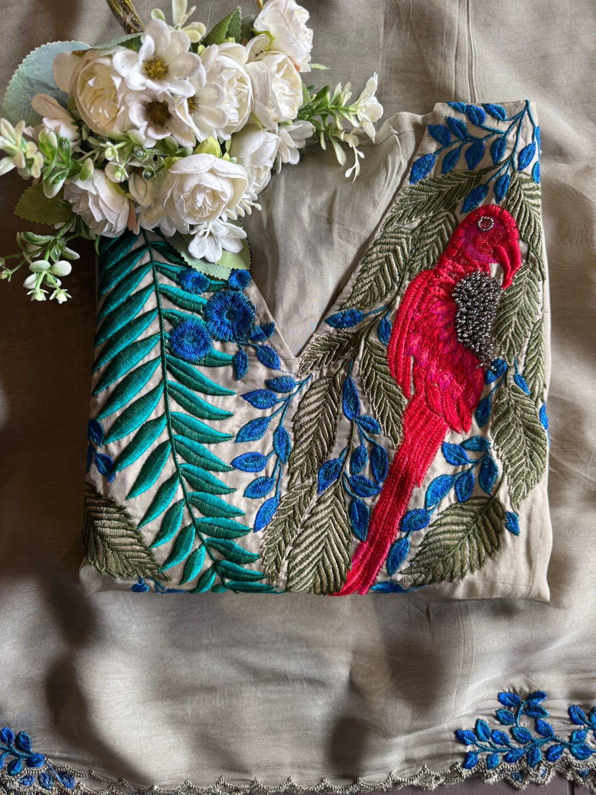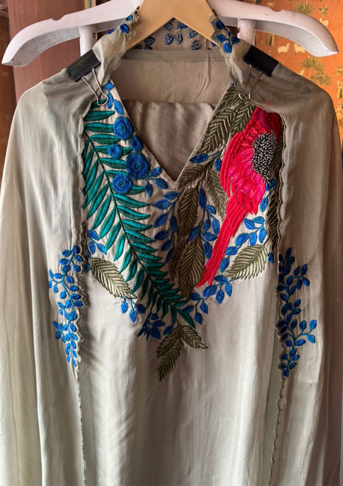 Overall, this design gives a tropical yet elegant look, combining the bold parrot with traditional floral embroidery. It can be styled as a party-wear kurta or long kameez, especially suitable for evening occasions.