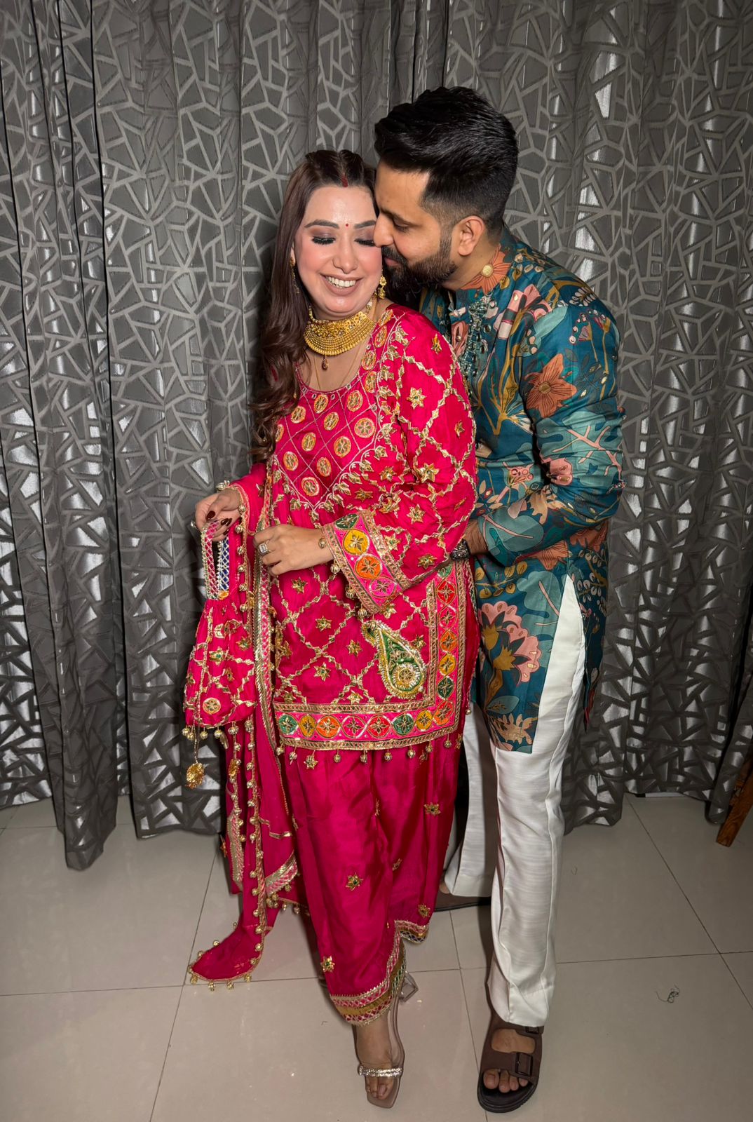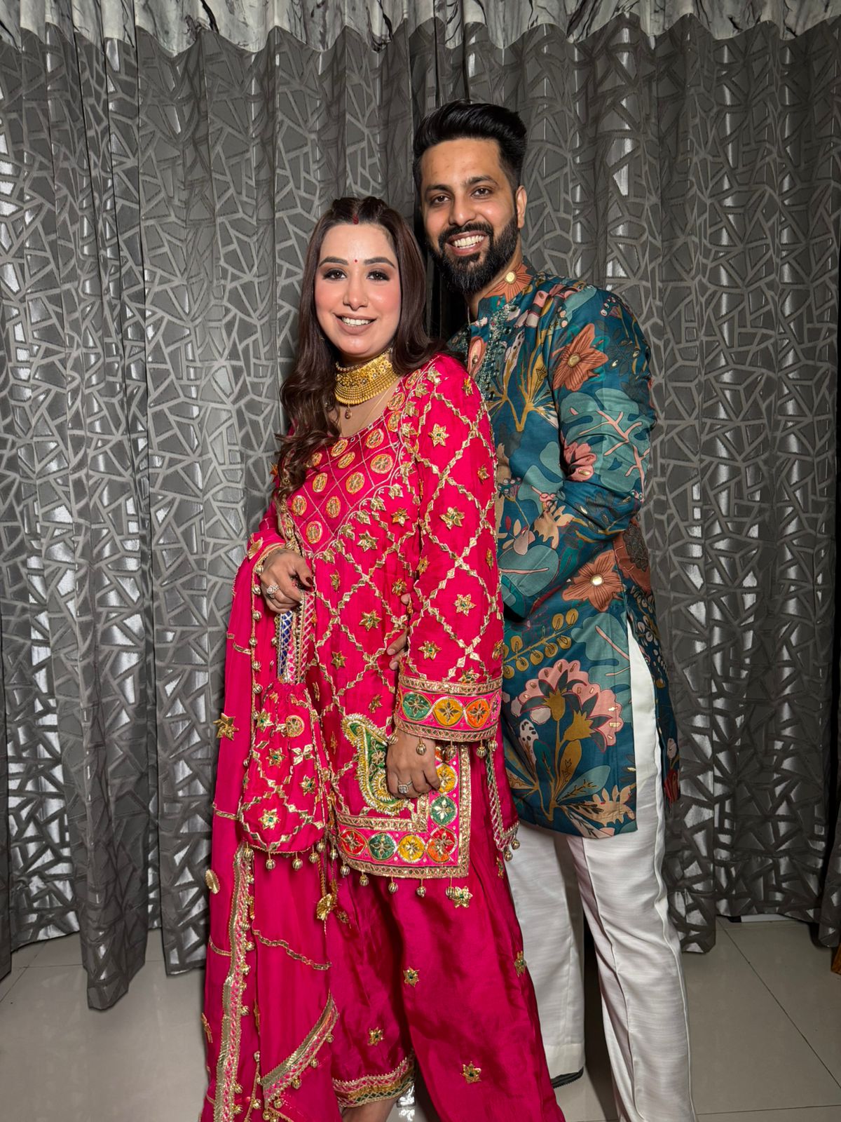Golden zari and gota patti work create a (jaal) pattern throughout the kurta.