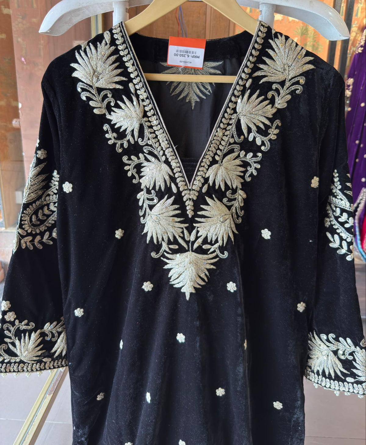 The full set has Light gold ari work embroidery , giving it a kashmirir look.