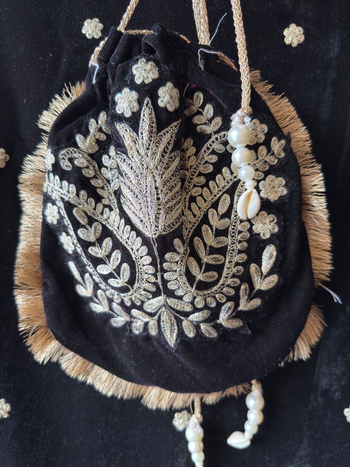 The outfit is paired with a matching mini potli bag, designed with the same border and fringes.