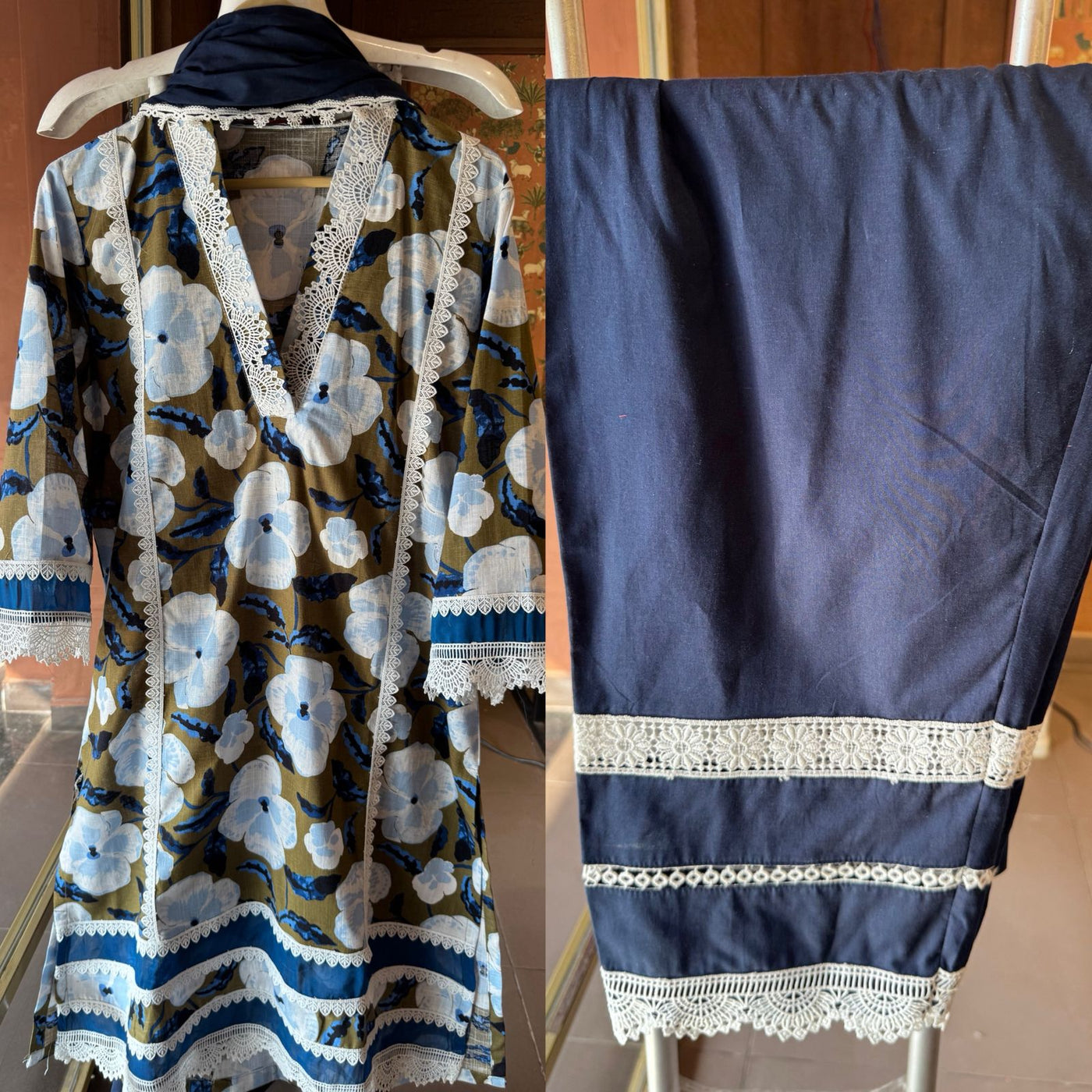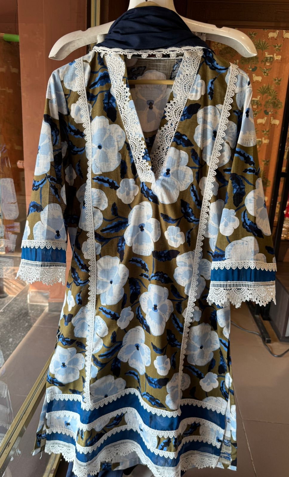 Three-quarter sleeves with lace Flared A-line cut with layered blue panel and scalloped white lace finish