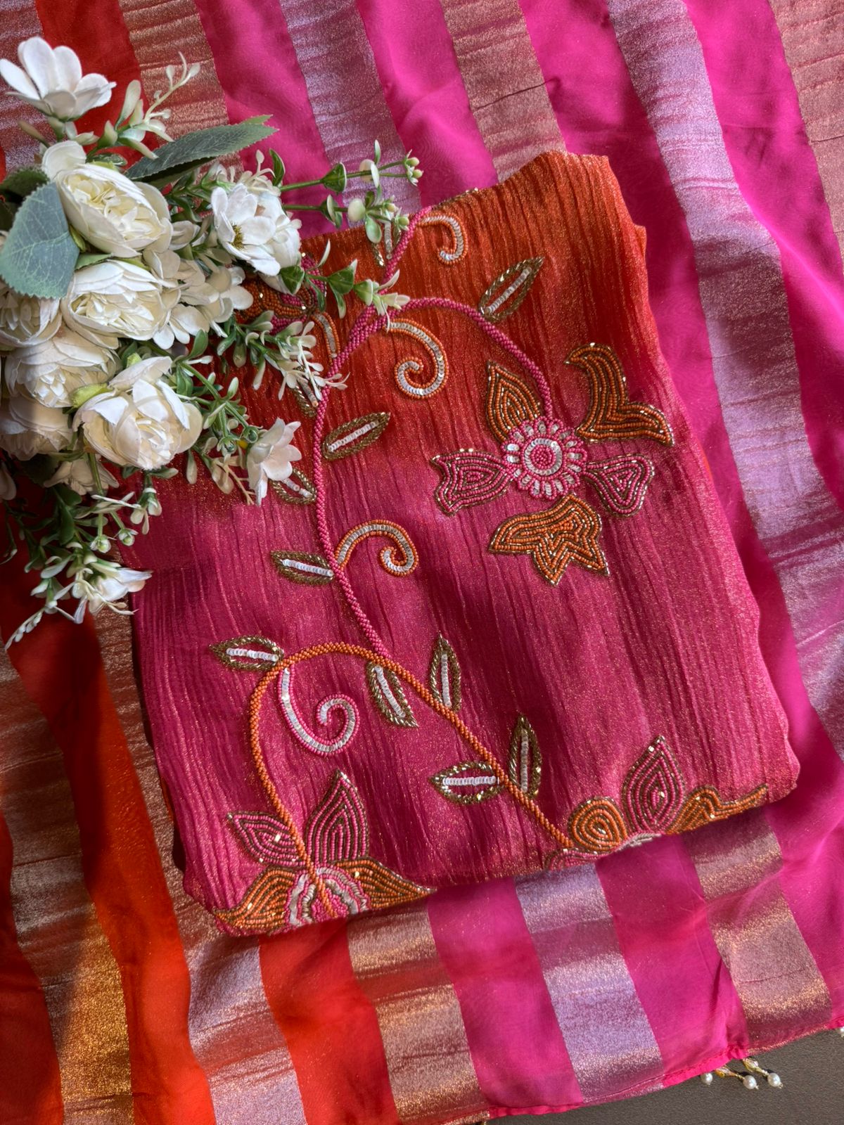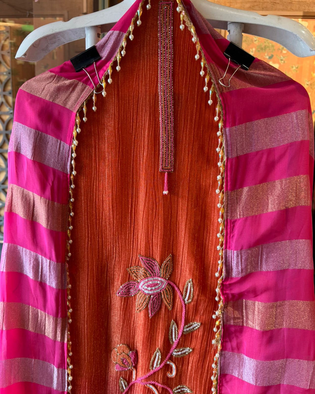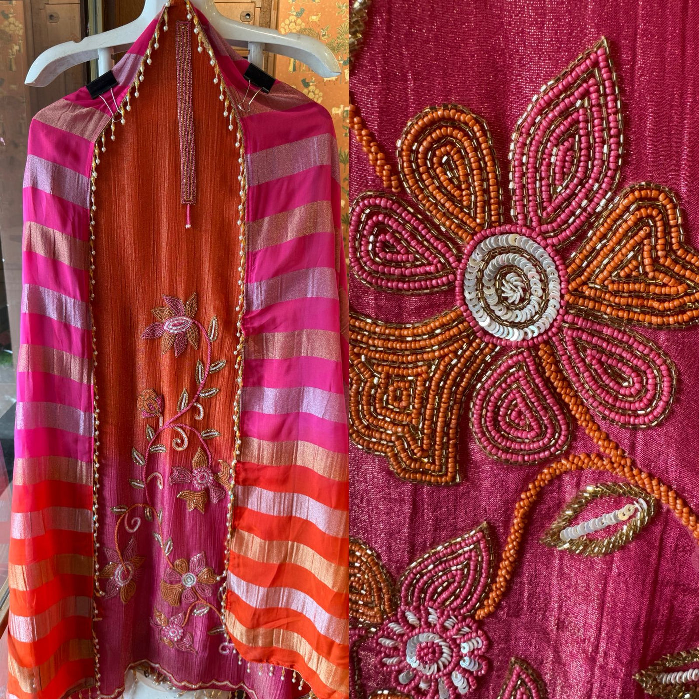 Tissue fabric (Unstitched) shirt with ombre shading , Bead/Cutdana Work done on the neckline.