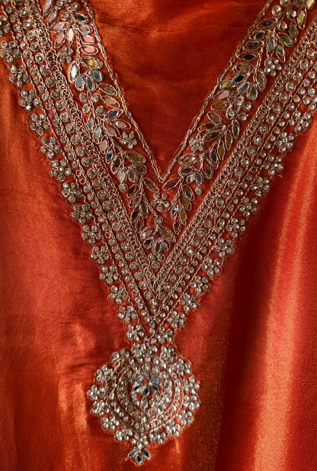 Heavy V-neck design intricately embroidered with zari, sequins, stones and mirror work, forming floral  motifs.