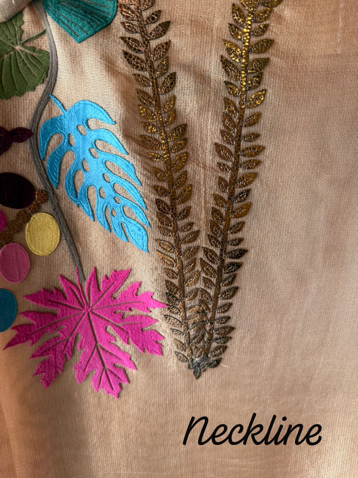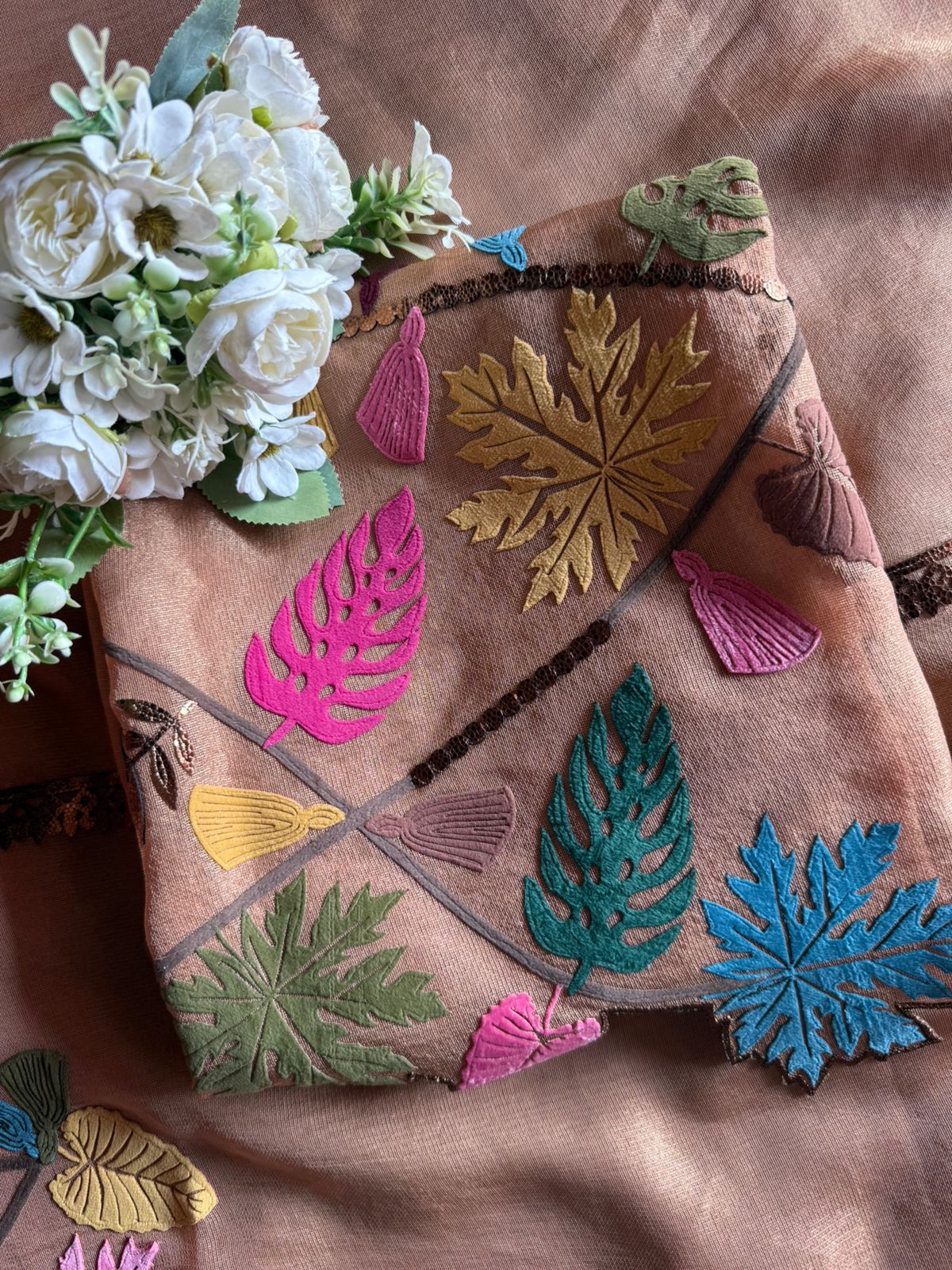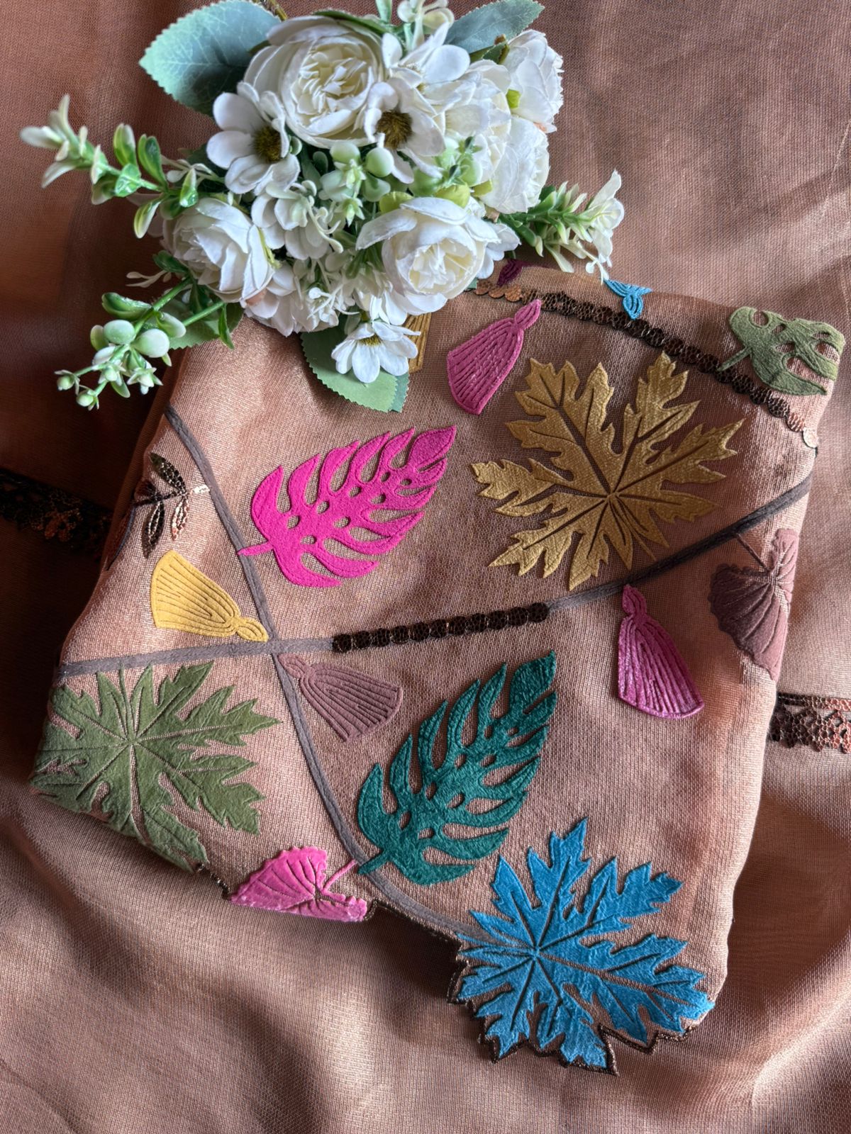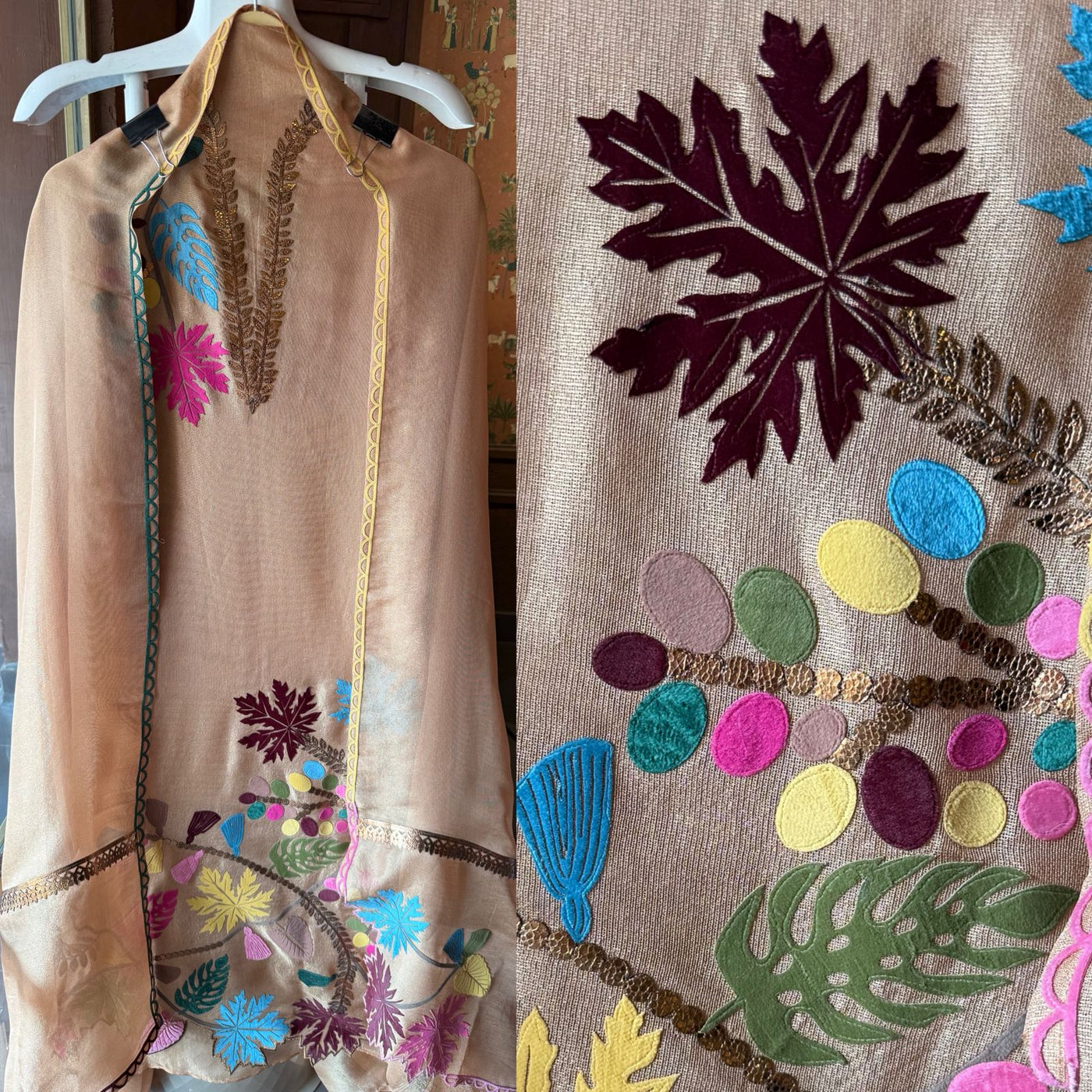Embellished with multi-colored thread embroidery (floral and leaf motifs).