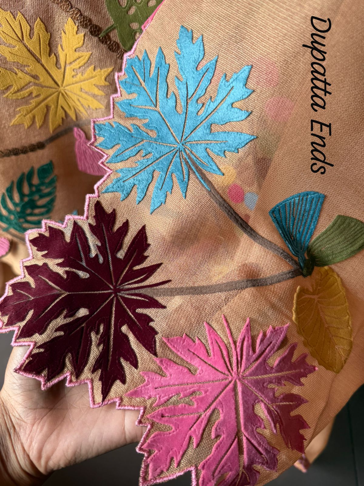 Buberry Tissue Dupatta with designer border with velvet appliqué work on the two ends , beautifully done.