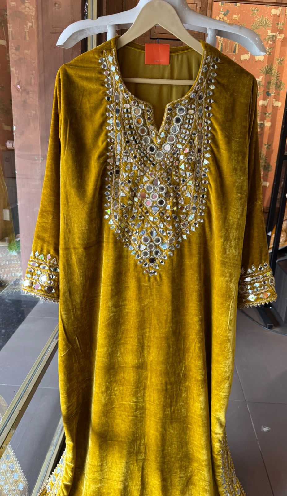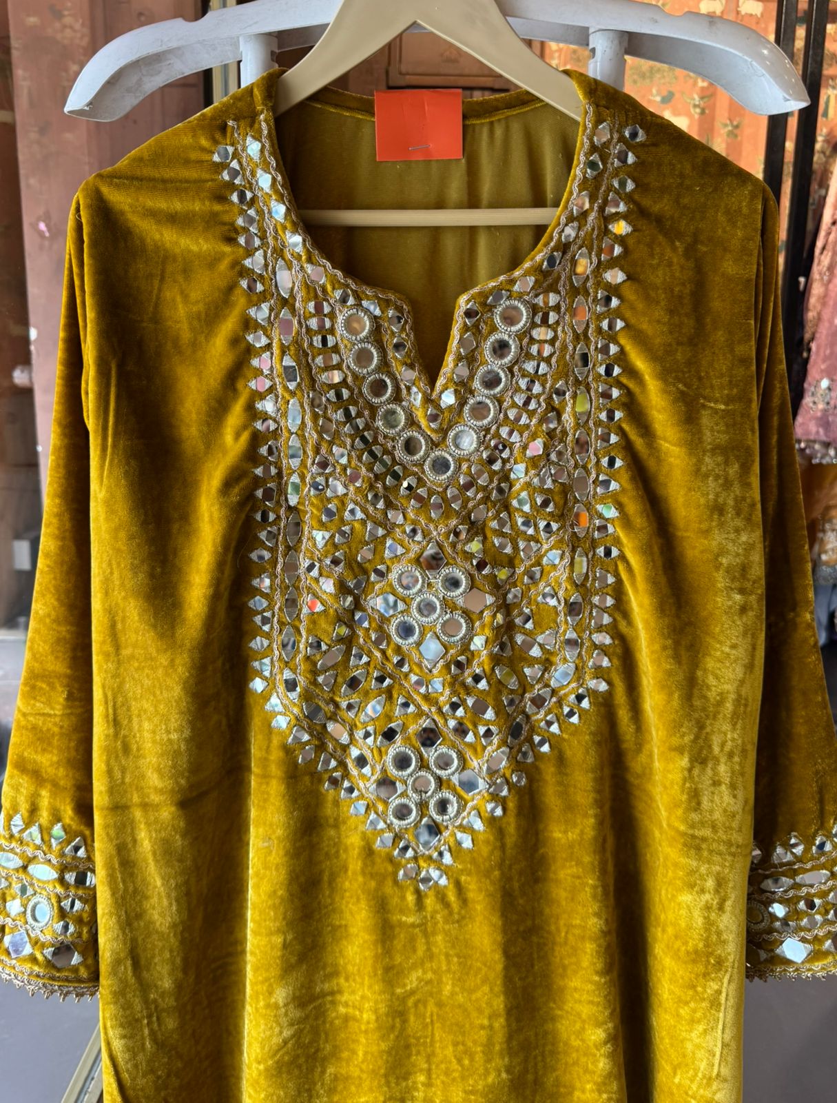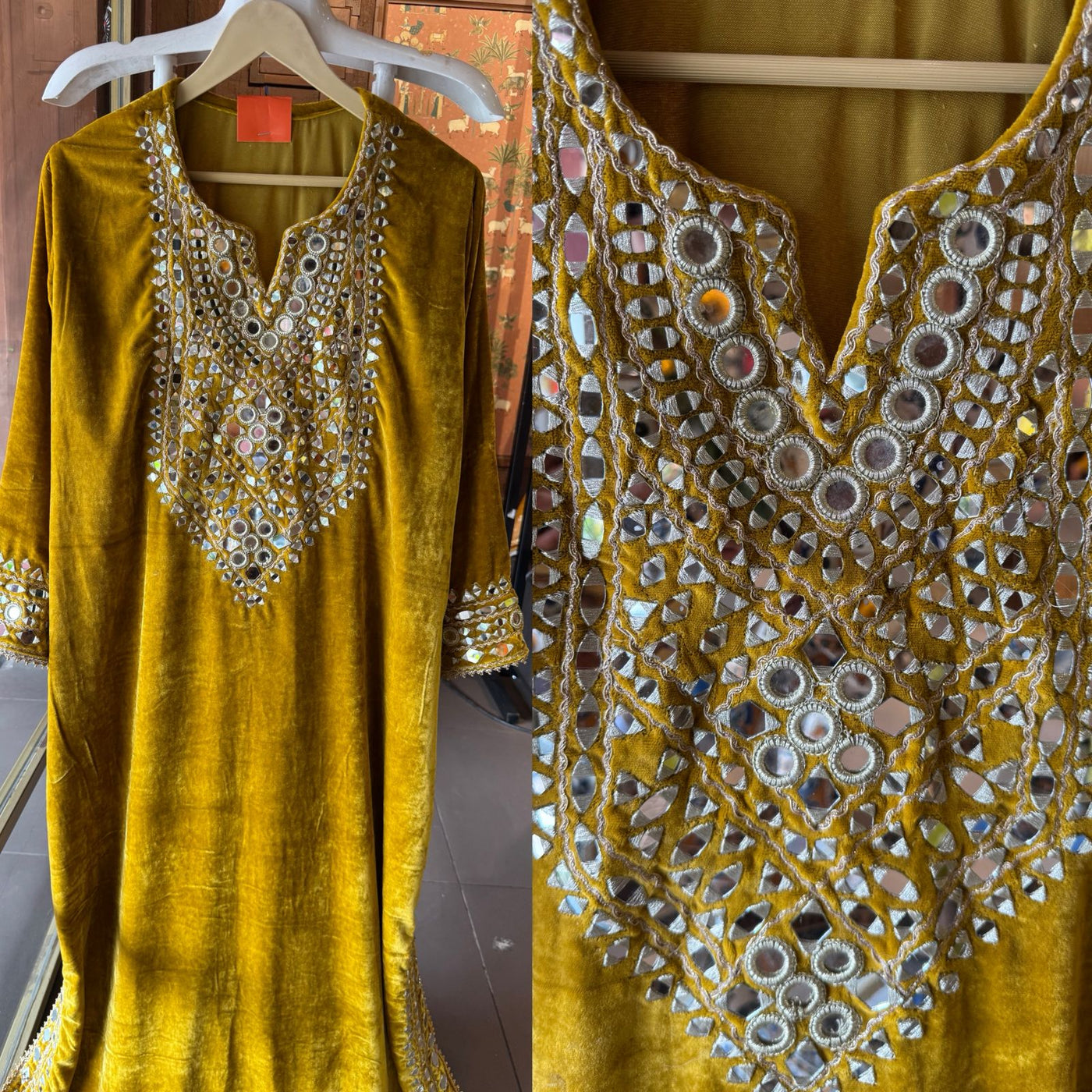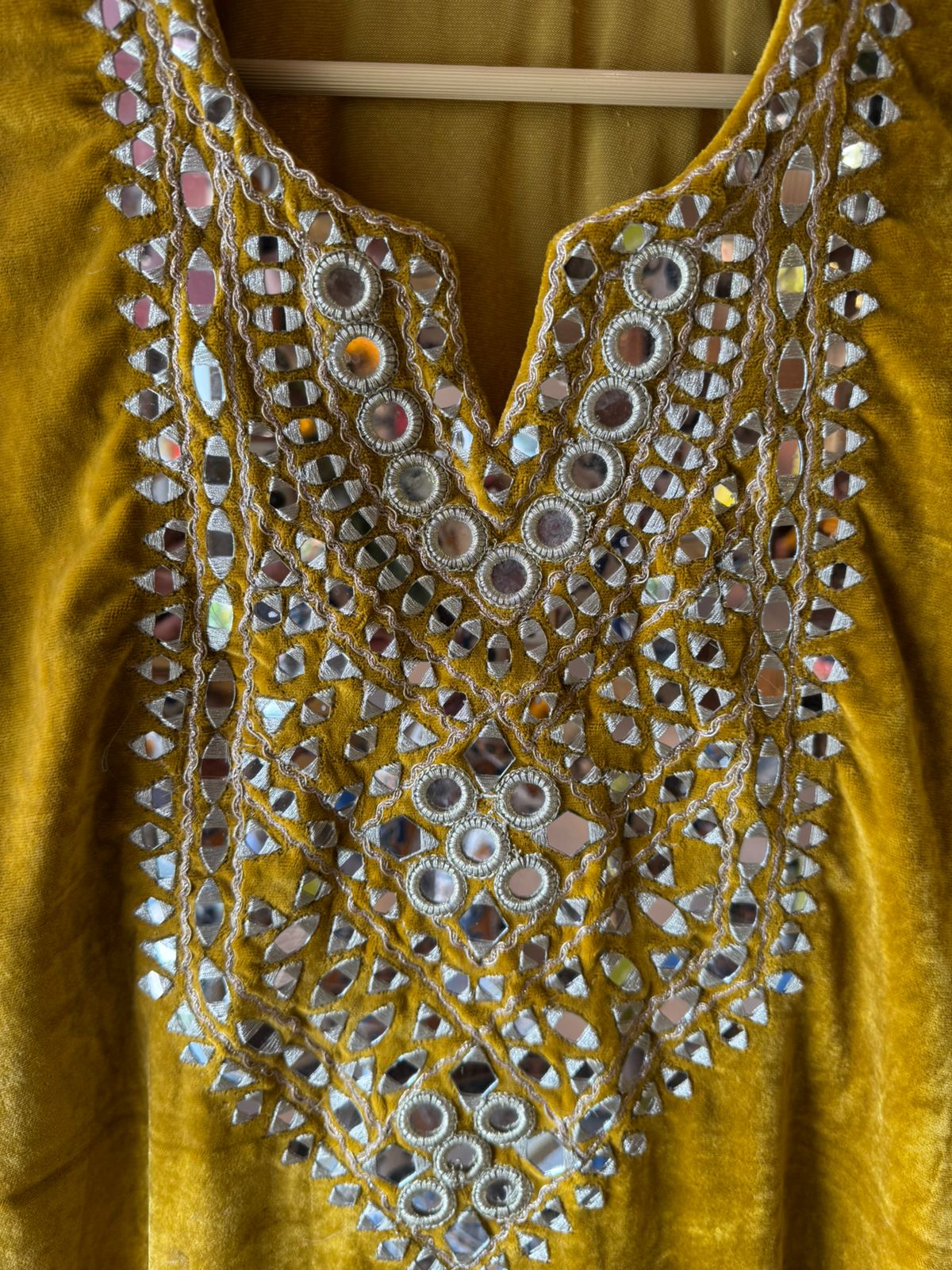 Heavy mirror work (shisha embroidery) on neckline, sleeves, and lower hem