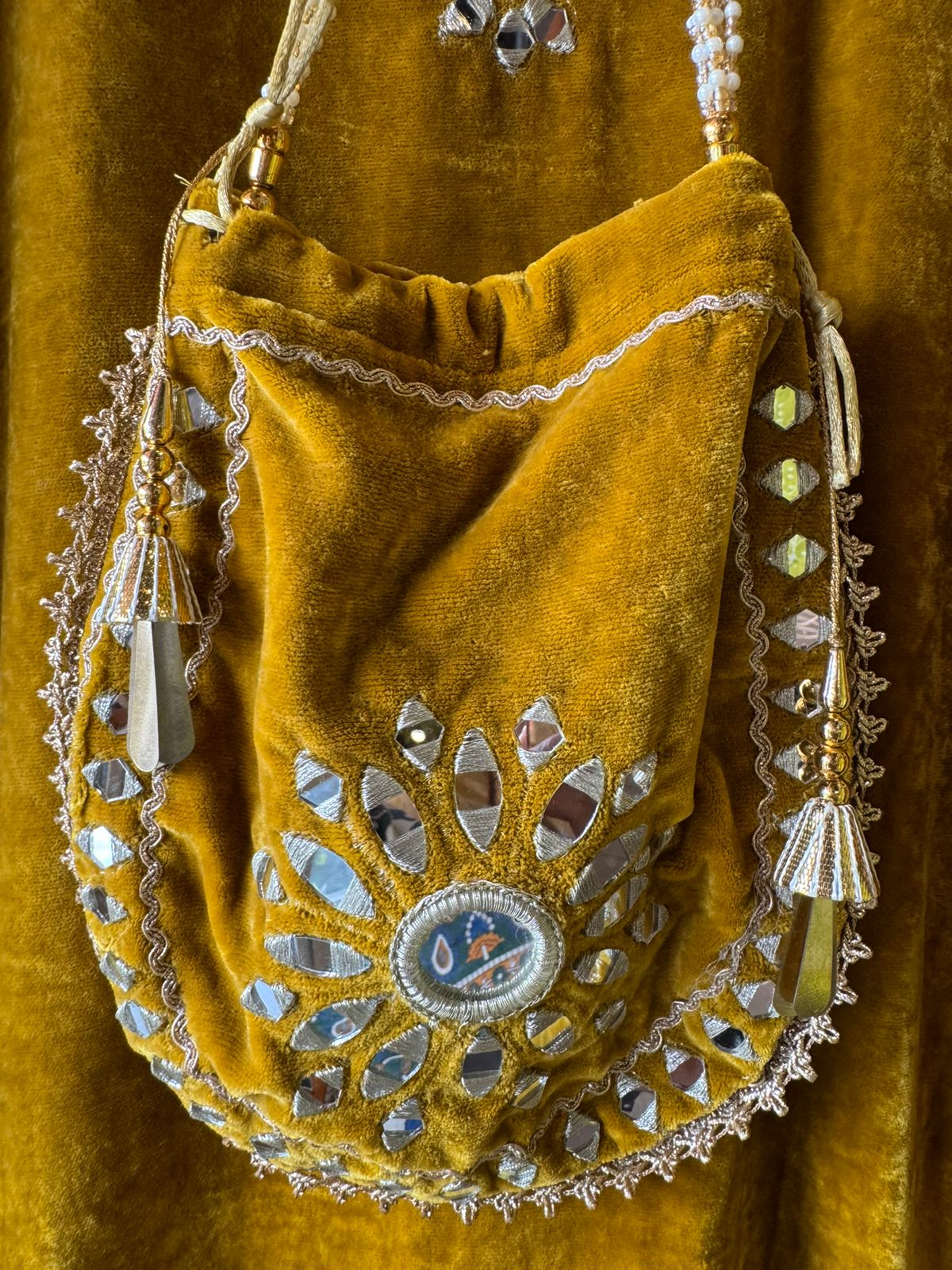 Golden zari / thread embroidery outlining the mirrors and forming floral + geometric motifs