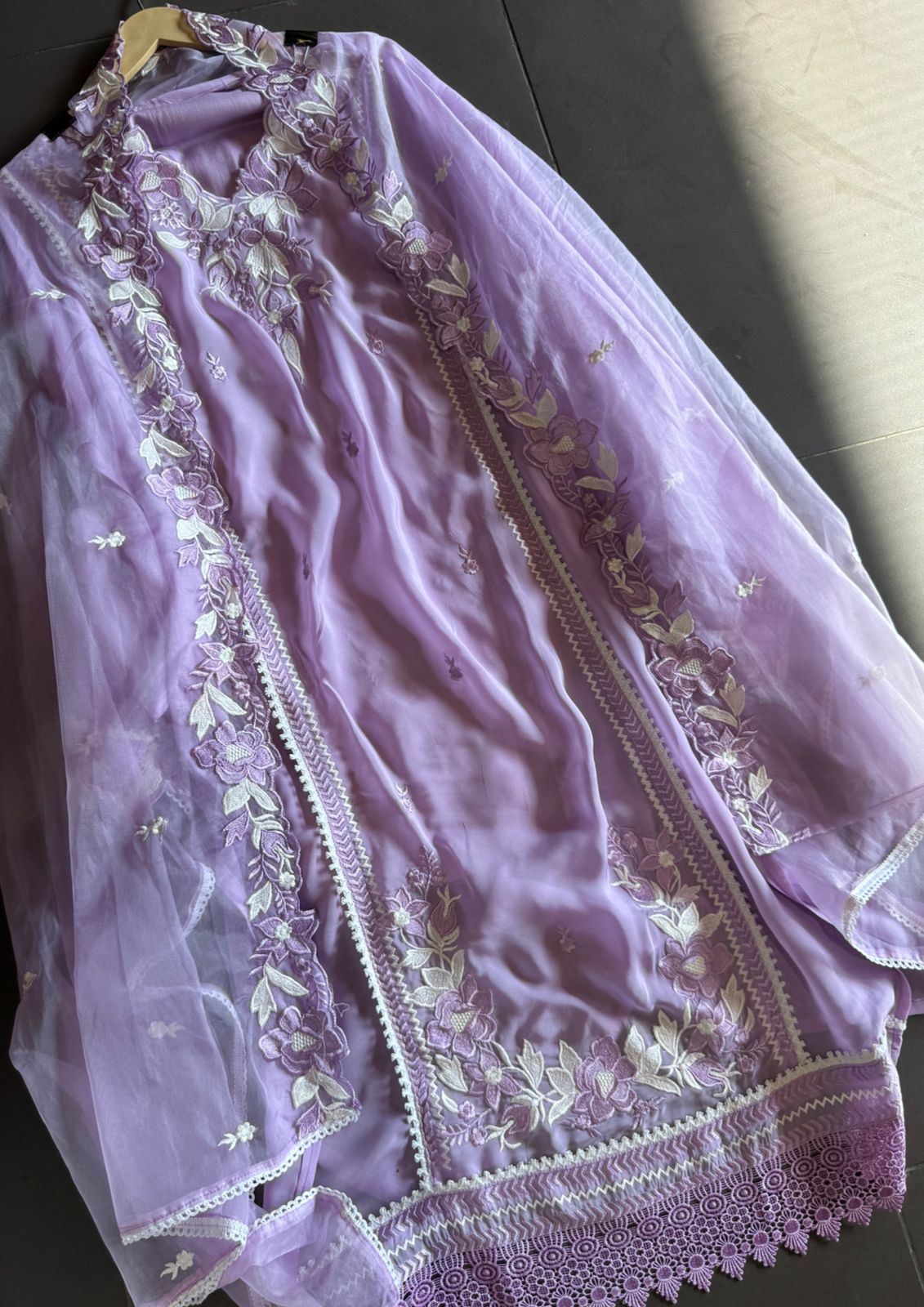 Soft organza shirt semi stitched with beautiful floral thread embroidery concept on the neckline and ghera of the shirt with designer crochet lace attached on the ghera