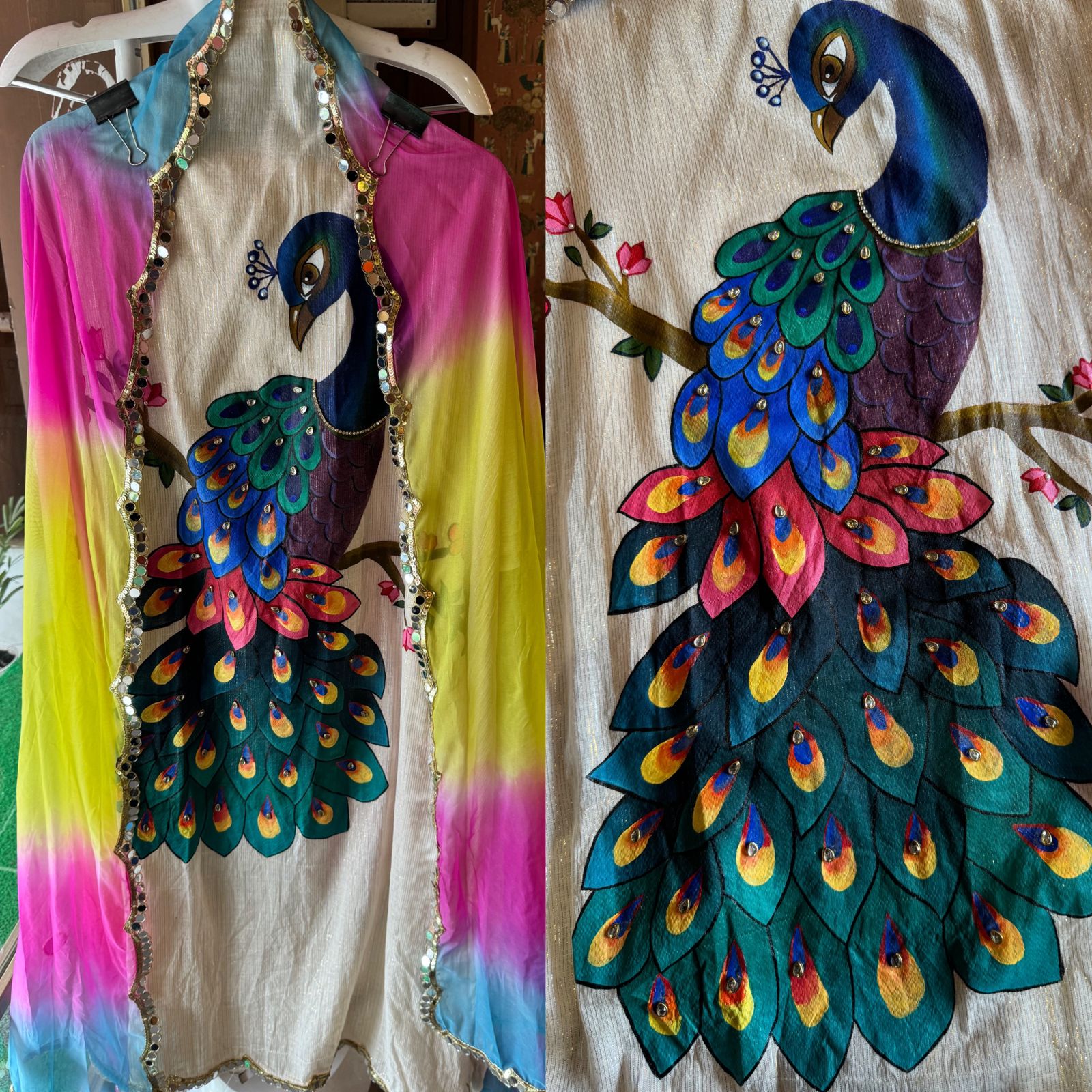 Cotton lurex Unstitched Shirt With Beautiful Handpainted mor design with all handwork detailings on the front