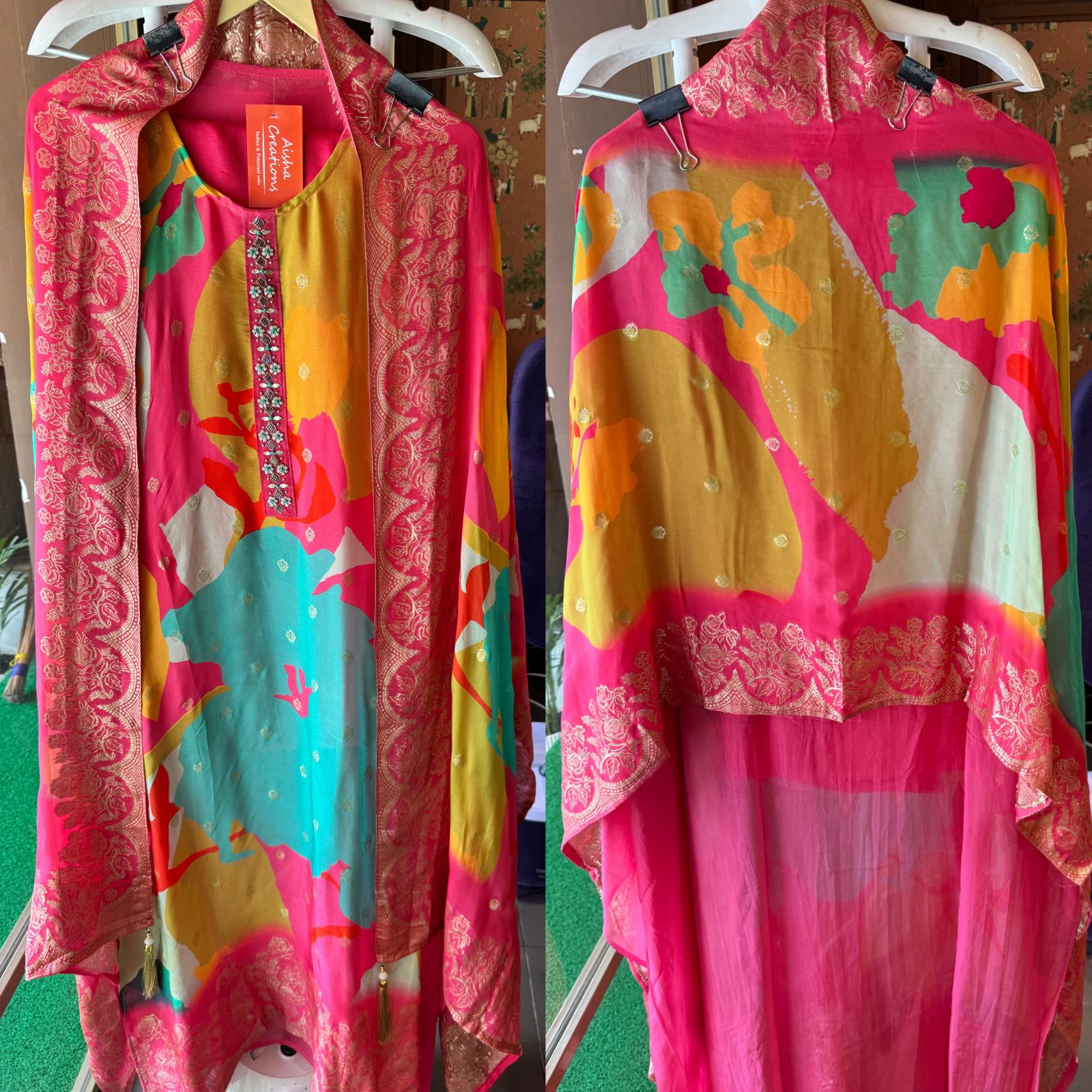 Digital printed organza shirt (Multi coloured) Concept with neck Patti with Hand embroidery