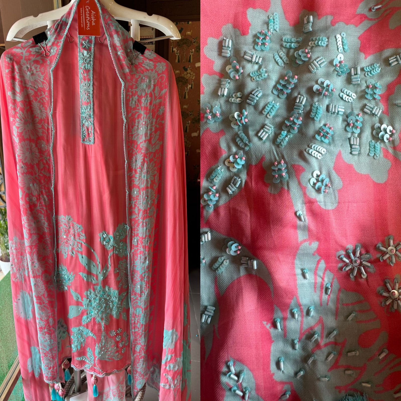 Premium Quality soft organza digital printed suits with handwork detailings on the shirt from and even on the neck Patti.