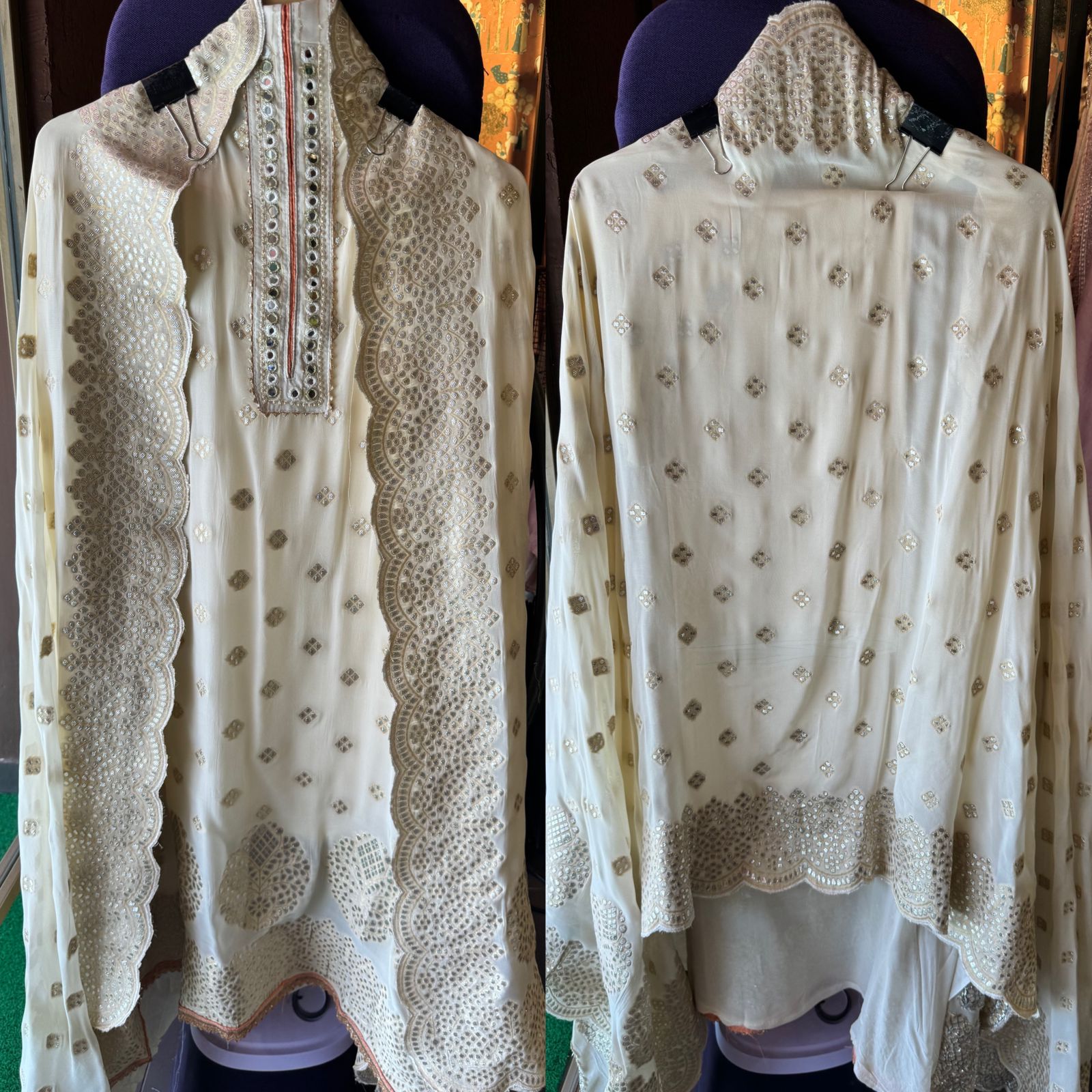 Pure banarsi Georgette shirt with overall zari booties with very beautiful neckline with mirror work done.