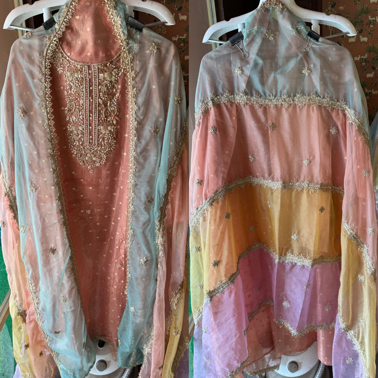Pure chanderi Unstitched Shirt with Dabka work detailings with pearl and beadwork done on the neckline