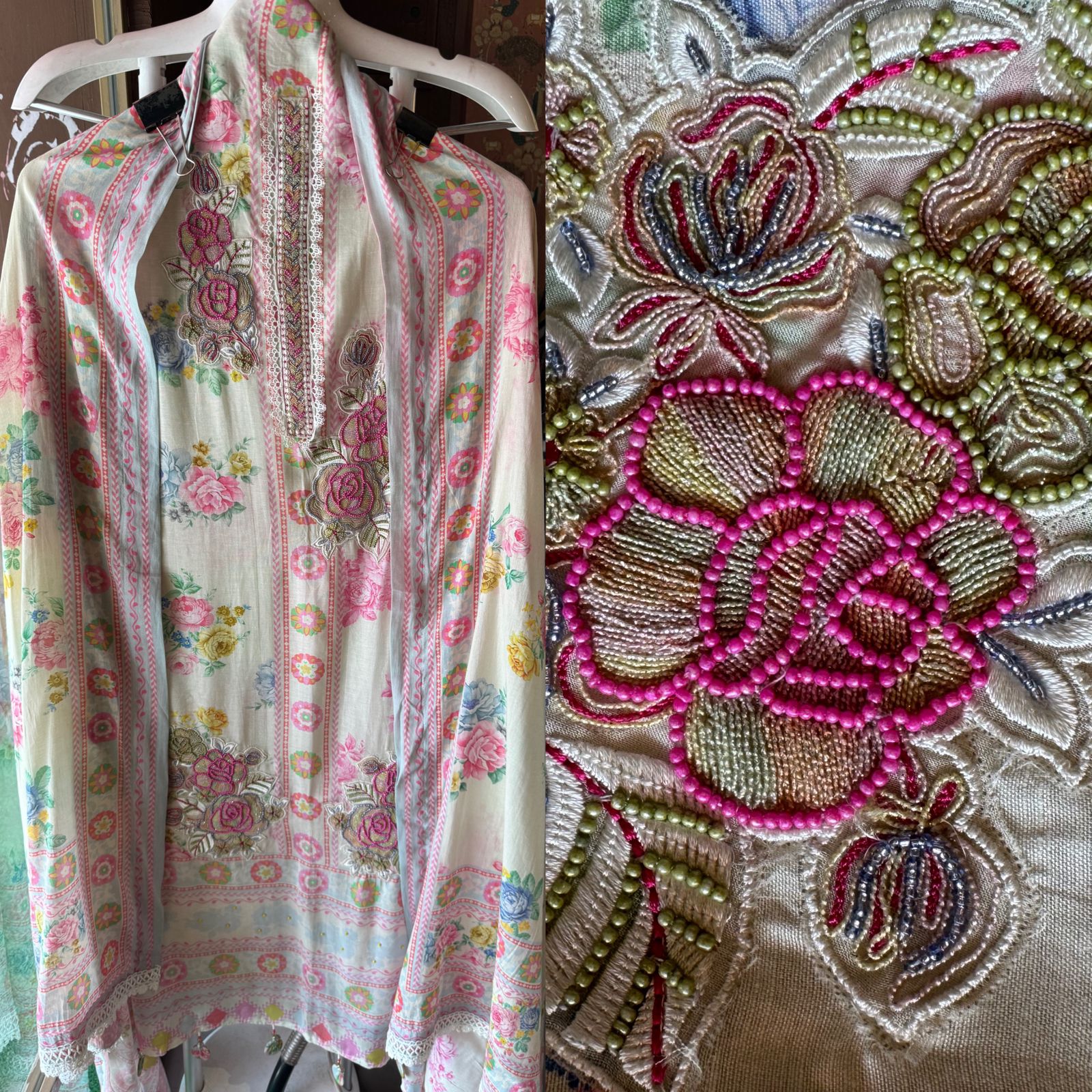 Pure handloom cotton Digital printed unstitched suit with Floral handwork/handembroidered