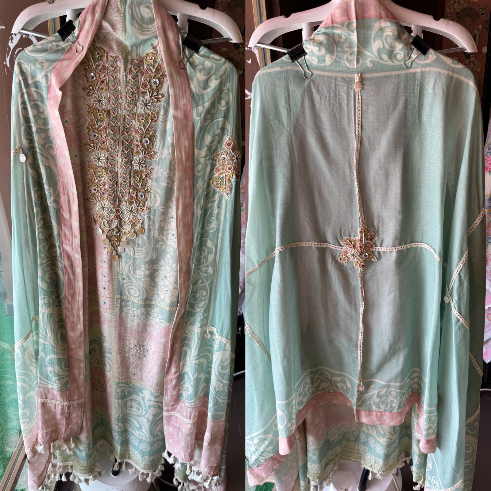 Pure handloom cotton Unstitched suit piece very beautiful print with handwork highlighting on the complete shirt front