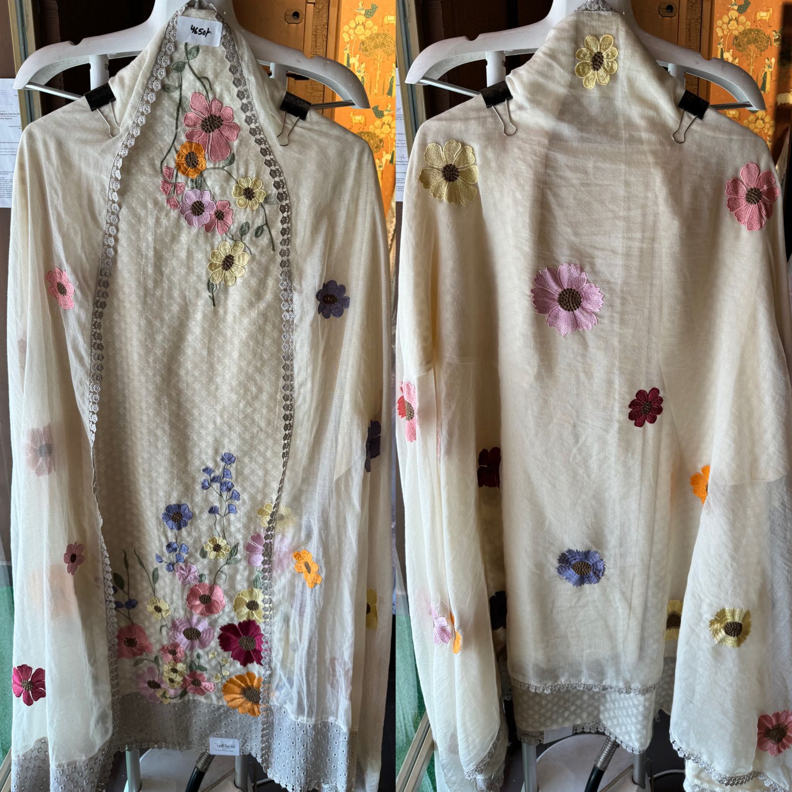 Pure jamdani cotton unstitched full size shirt with threadwork on the neckline and shirt ghera