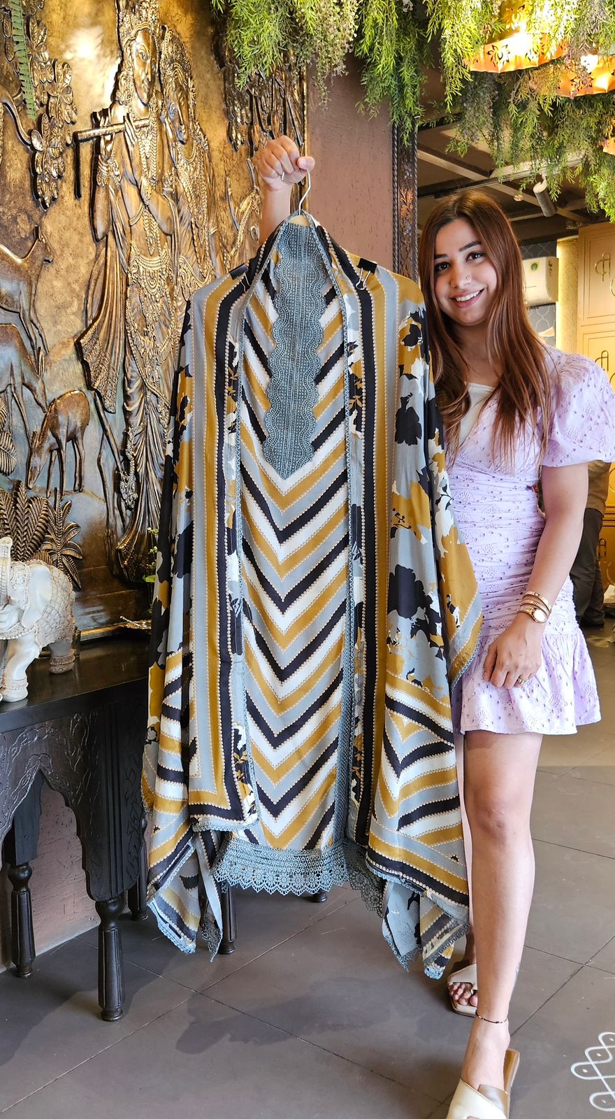 Pure Muslin Digital printed Shirt , Very smart and classy Concept with Cotton crochia neckline