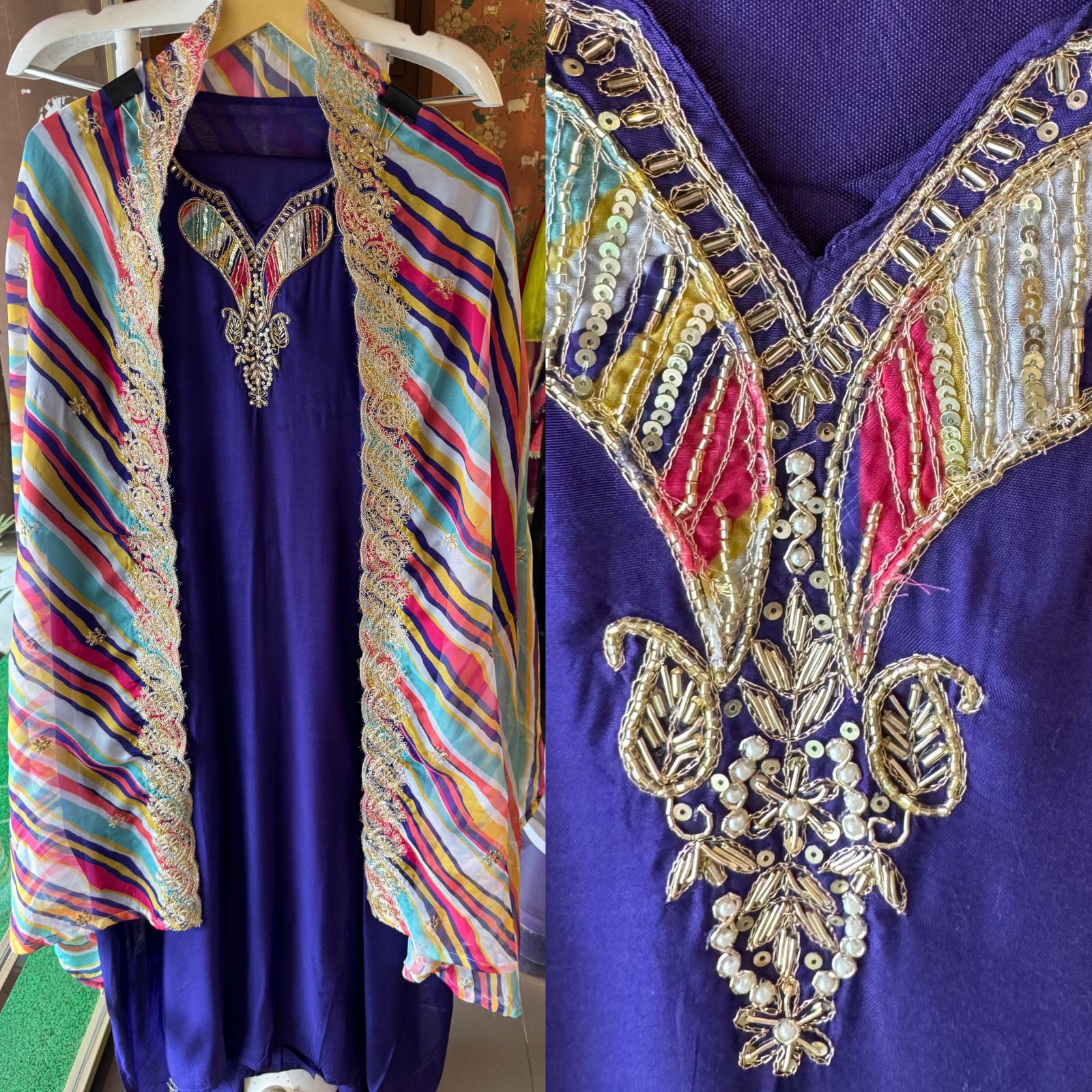 Pure Muslin Shirt (Unstitched) with only Neckline made with Beautiful nalki and Dabka work with multi coloured fabric detailings