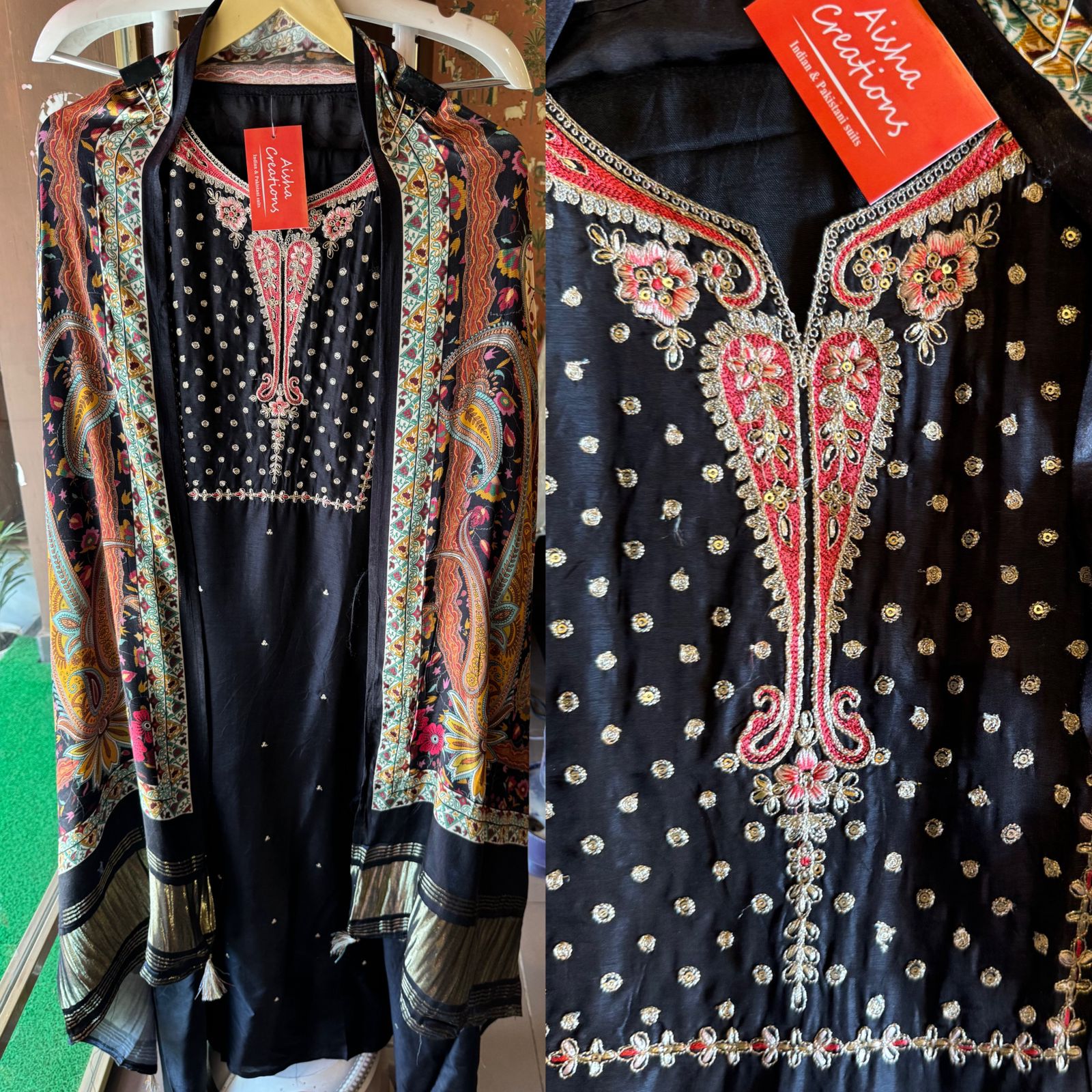 Pure Russian Silk Unstitched Shirt with very pretty Neckwork (Made with zari and dori work)