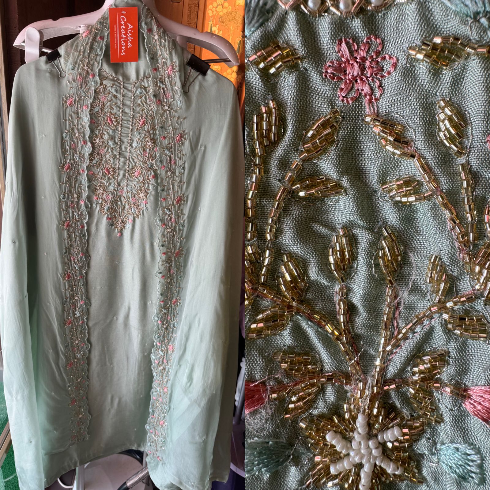 Pure silk shirt with beautiful handwork on the neckline with nalki , Dori work, thread work and pearl embellishments