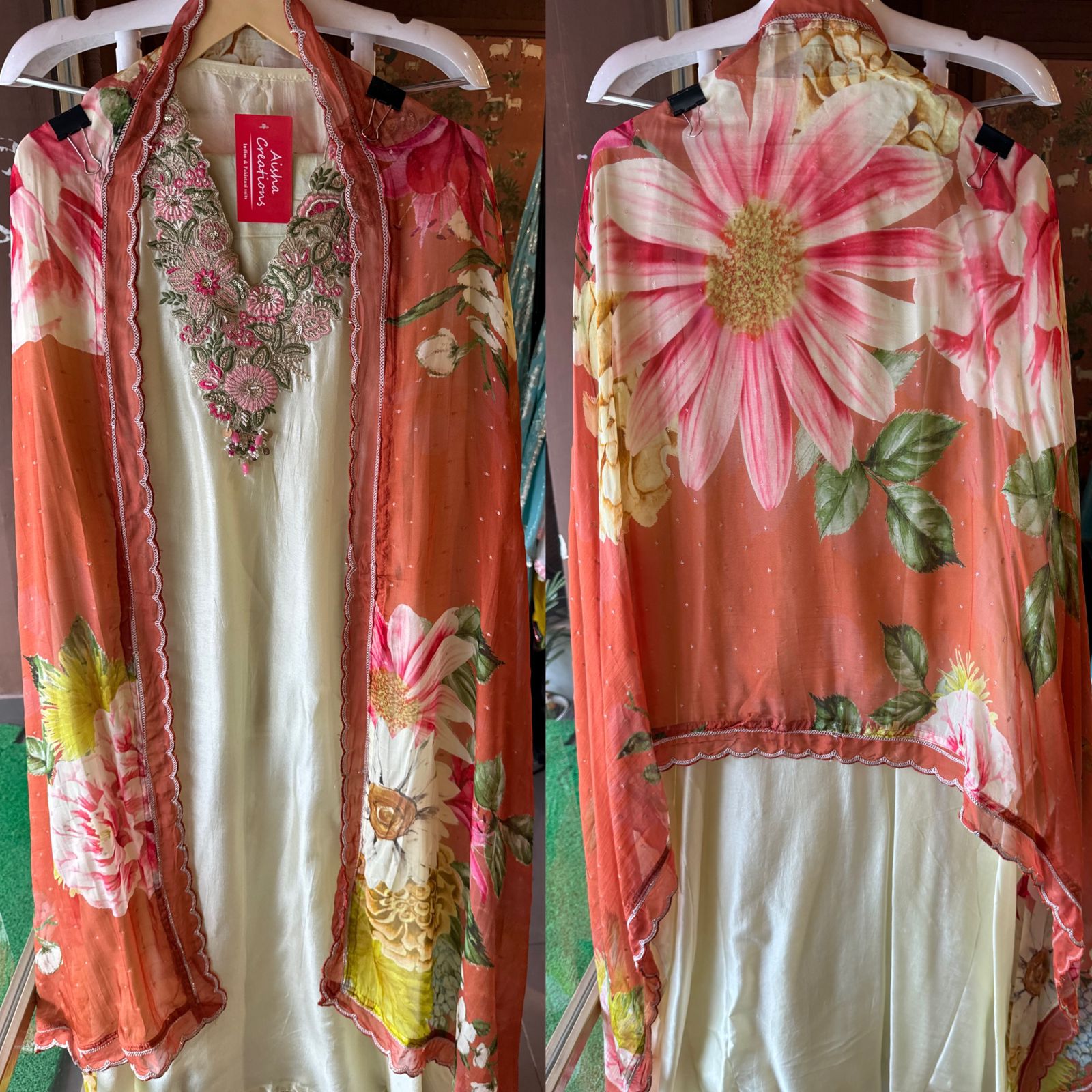 Pure Silk (Unstitched) shirt With Very beautiful and heavily embroidered neckline with beadwork , Thread work and dori work detailings