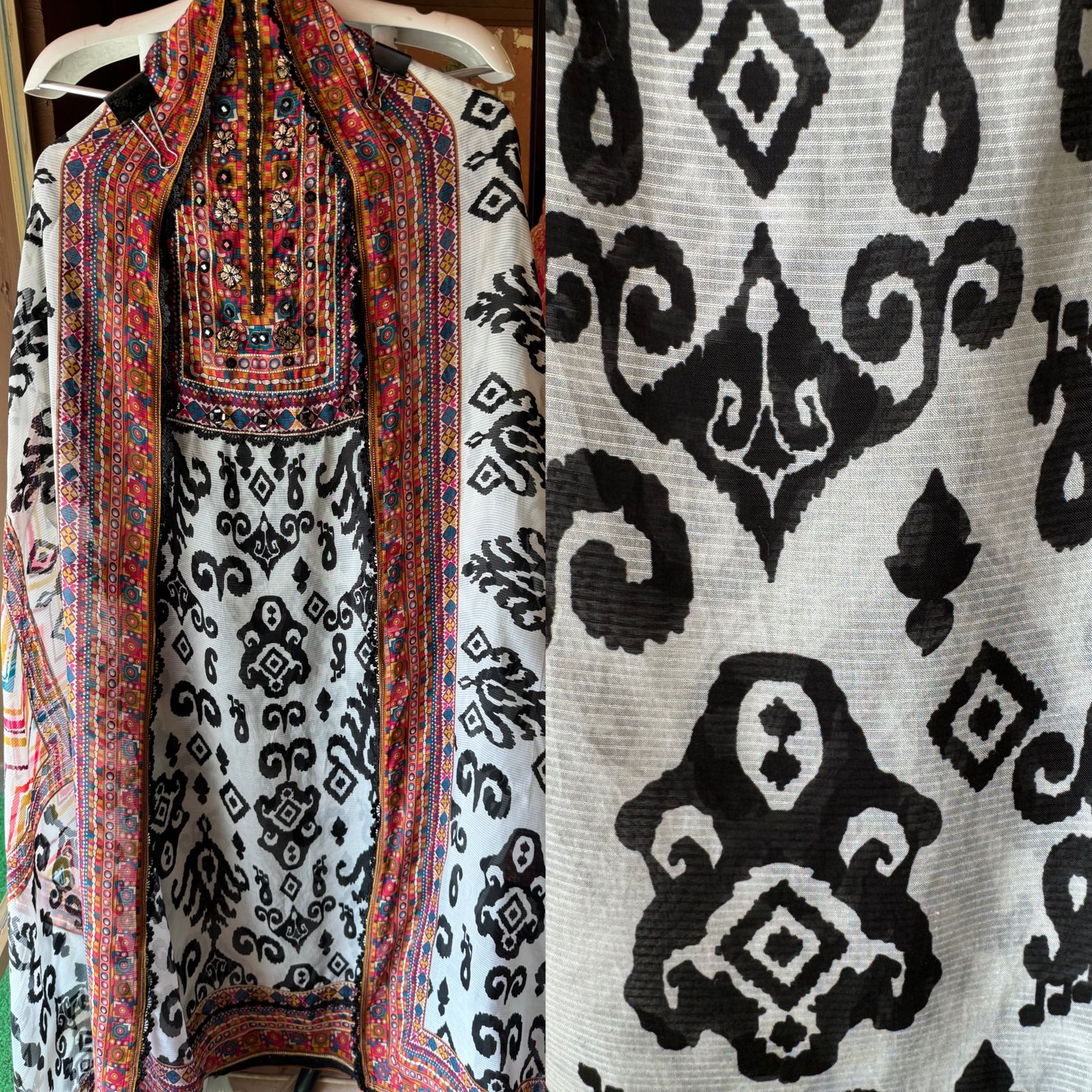 The neckline has Multi coloured print with original mirror and leather patti work