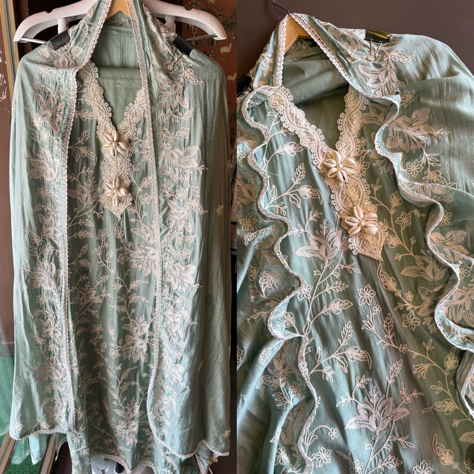 Soft linen cotton shirt (Unstitched)with crochia lace neck detailings with original shankh attached on the neckline