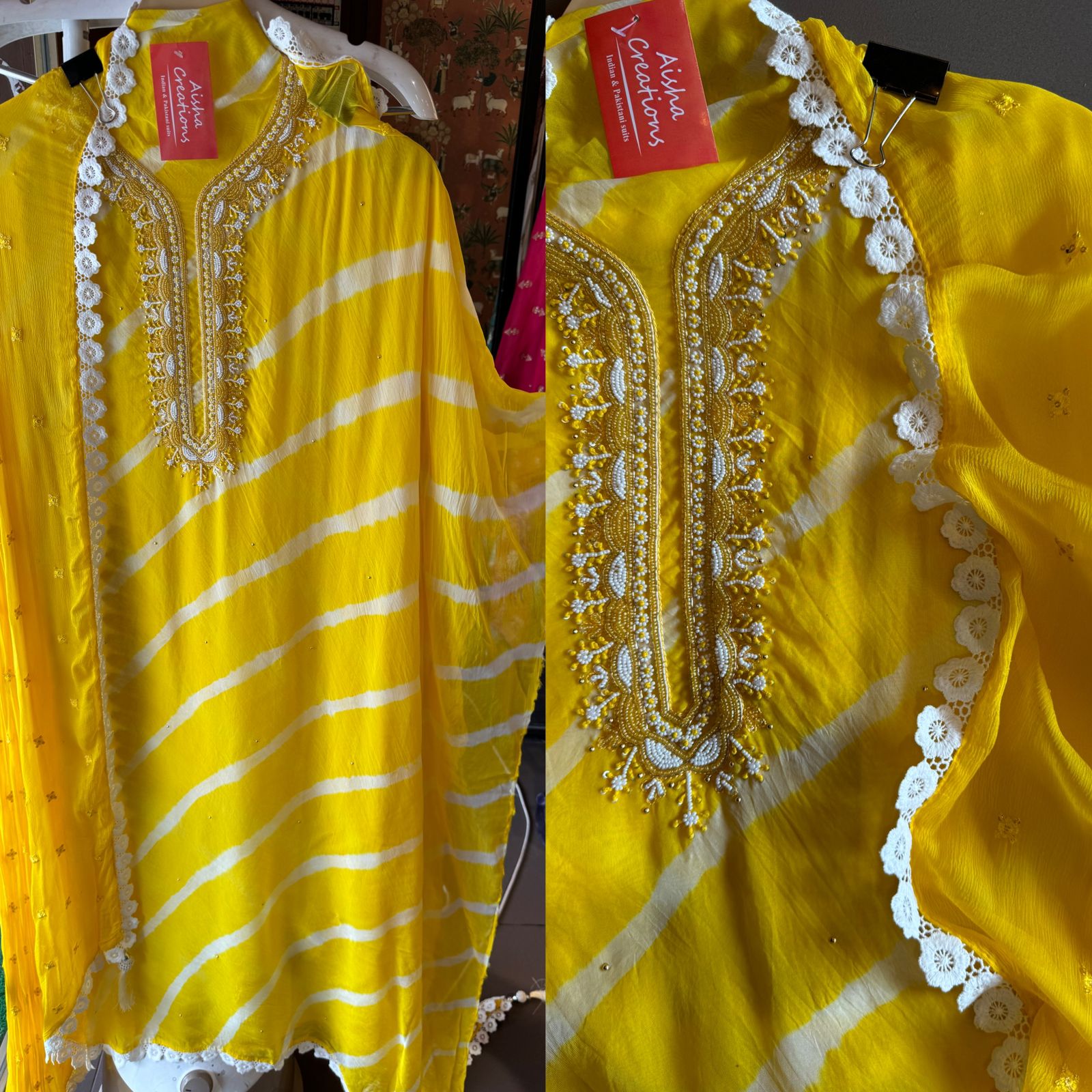 Soft organza Lehriya Printed shirt (Unstitched)With beautiful Neckwork done with Moti and pearl work