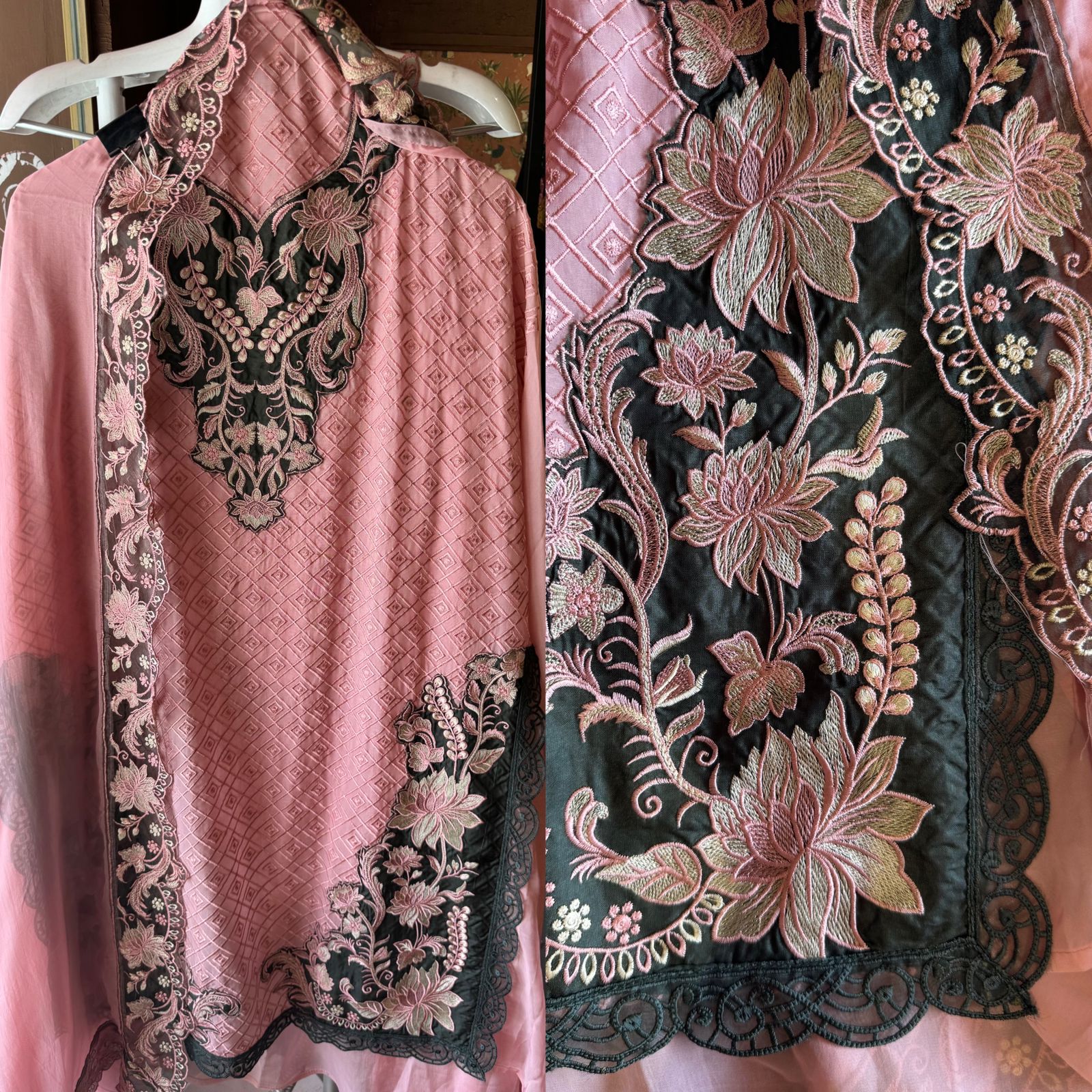 Soft organza self embroidered base with embroidered patchwork on the neckline with designer ghera and lacework done