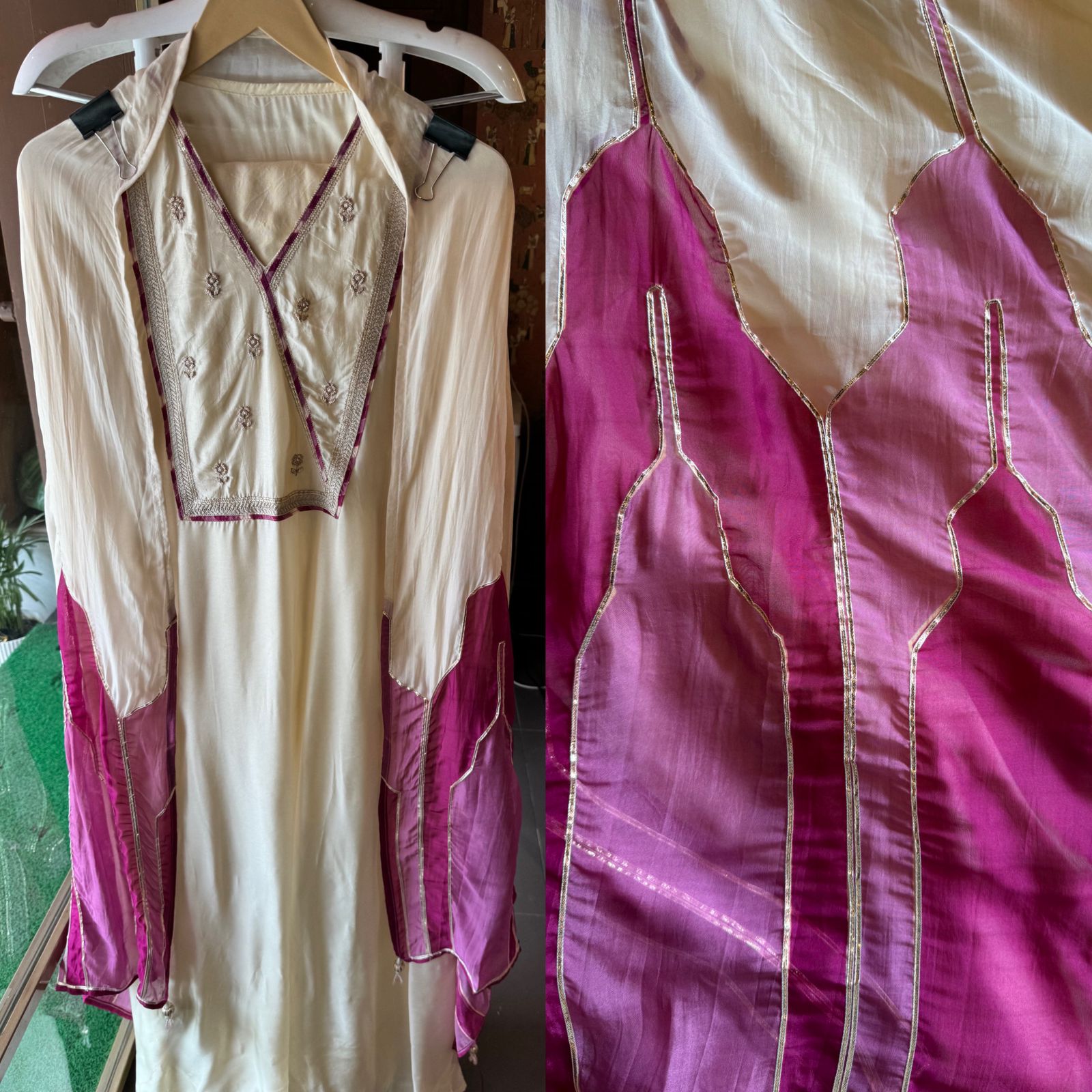 Soft organza Unstitched Shirt with angrakha design neckline with Dori and Dabka work booties with piping done.
