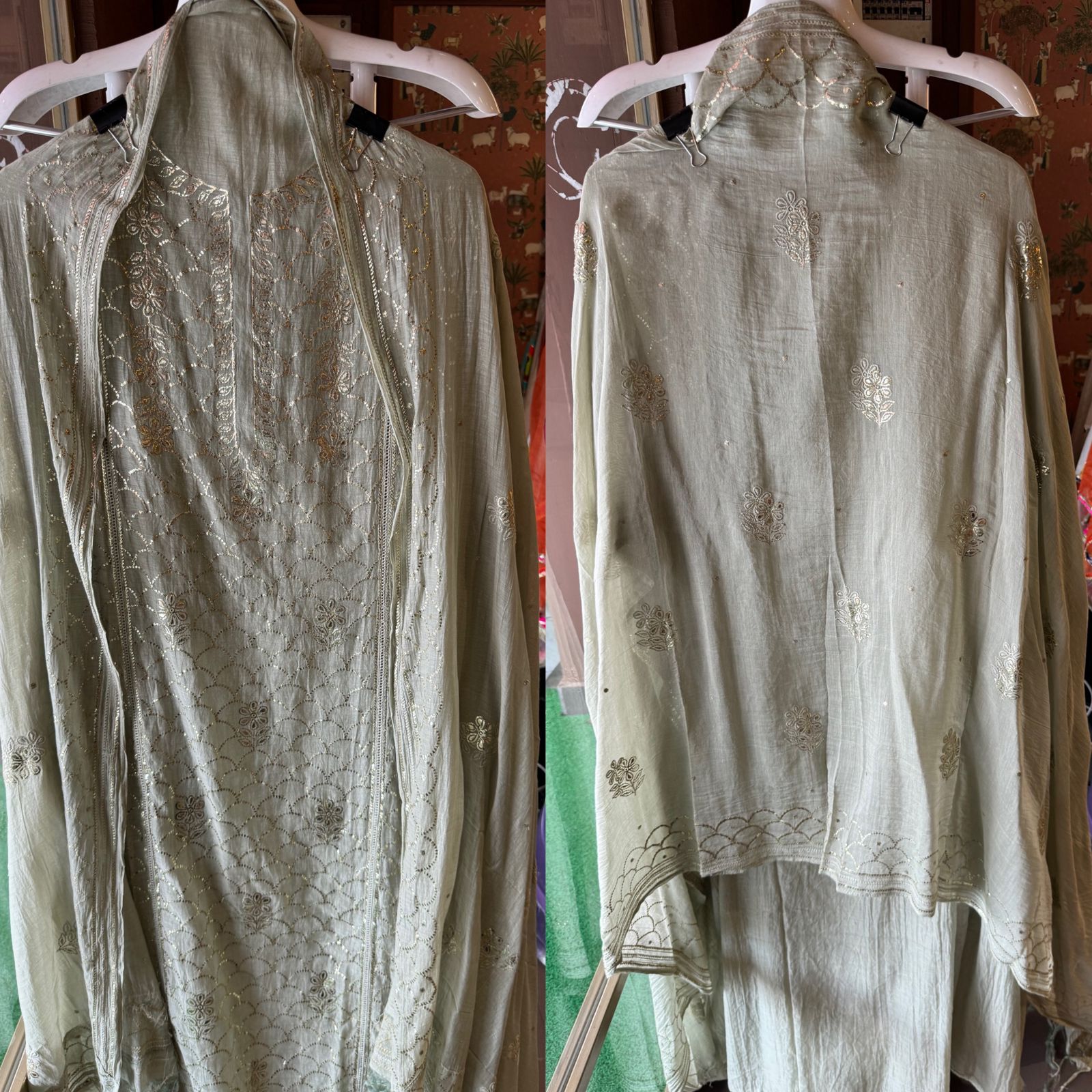 Unstitched Mul suit pieces with original pitta work done on the full shirt front giving it a very Beautiful & rich look
