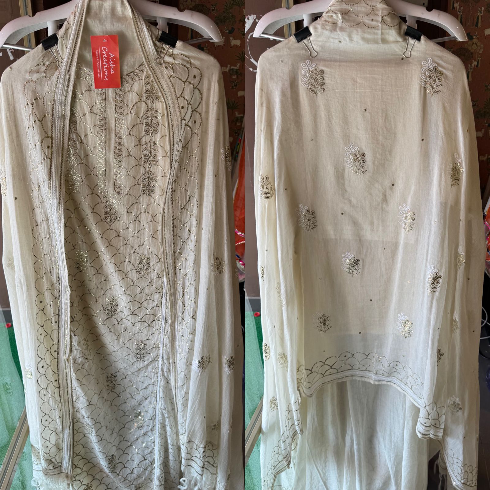 Unstitched Mul suit pieces with original pitta work done on the full shirt front giving it a very Beautiful & rich look