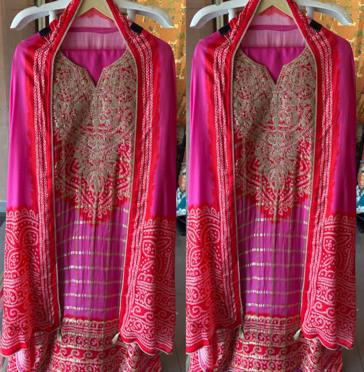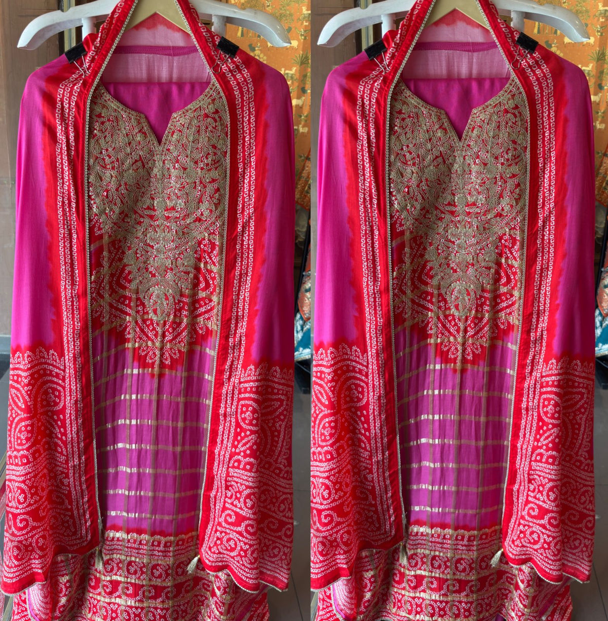 🌸 The outfit exudes a Rajasthani-Gujarati Bandhej aesthetic fused with royal embroidery — perfect for poojas, mehndi functions, or festive occasions.