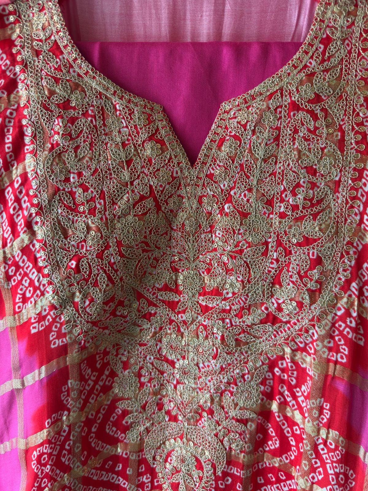 • Traditional Bandhani tie-dye technique enhanced with luxurious detailing.