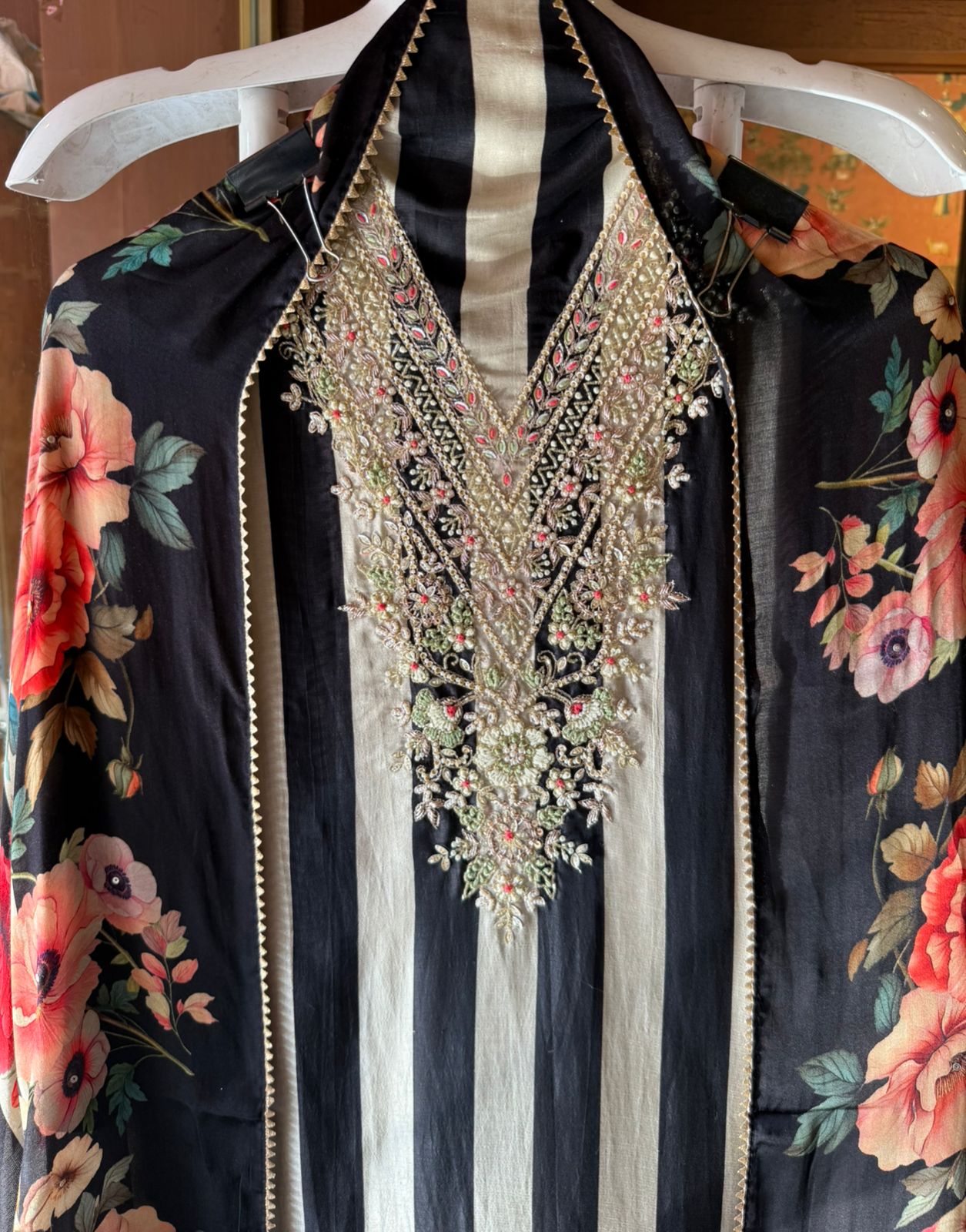 Outfit is a beautifully detailed embroidered suit set featuring a combination of modern stripes and classic floral patterns on SILK.