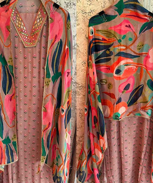 Digital printed Chinon shirt with Mirror and thread Neckwork Handwork done on the neckline