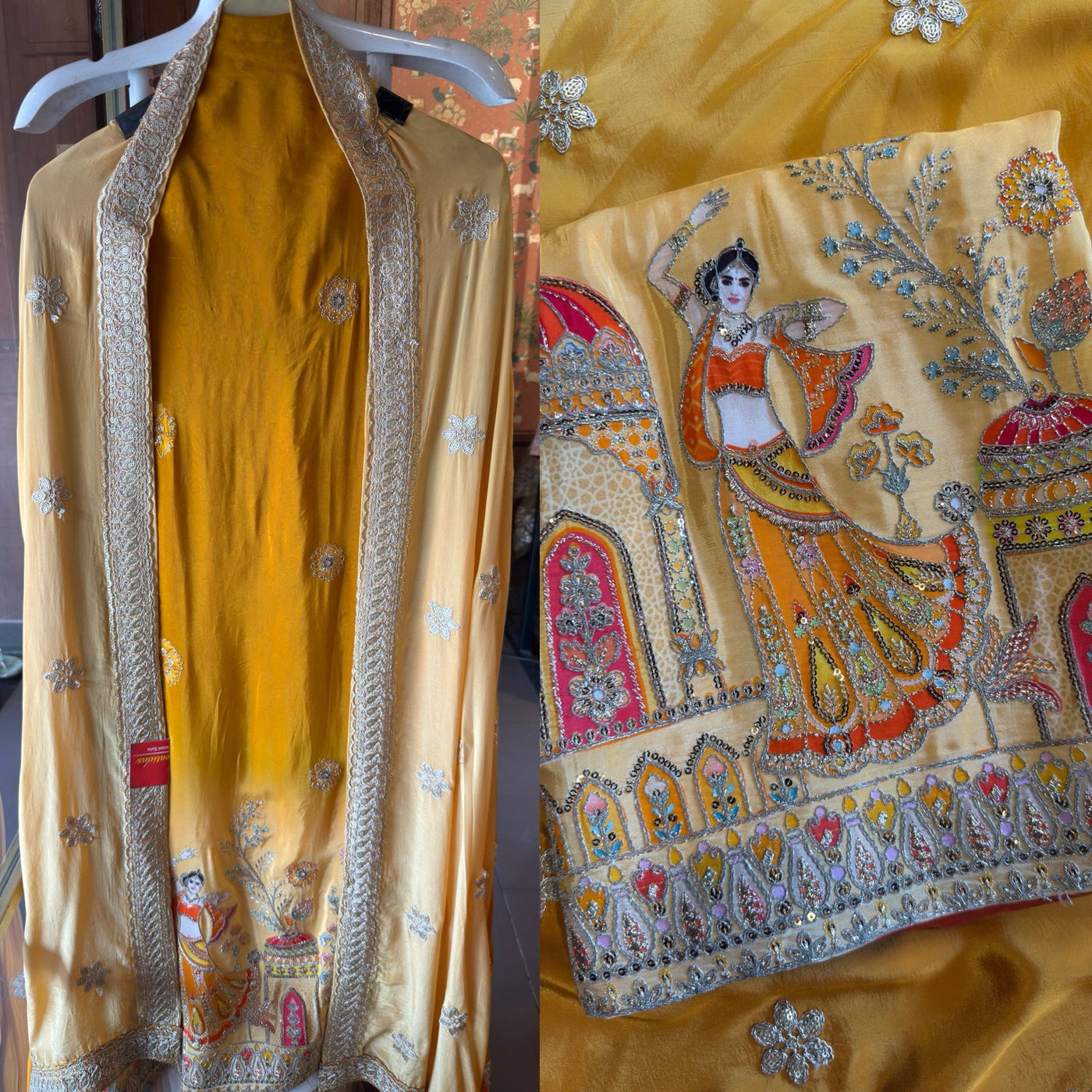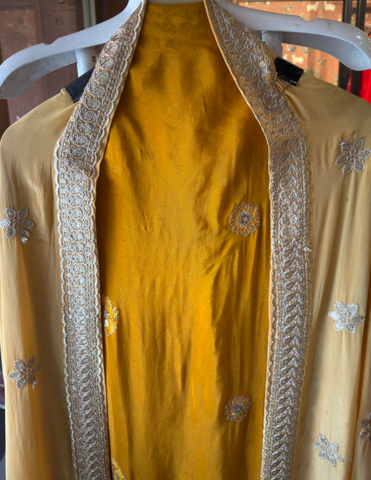 Ombré shaded Pure crepe Unstitched design with  Hand-embroidered / Zardozi-style detailing motifs scattered all over the shirt front and dupatta.
