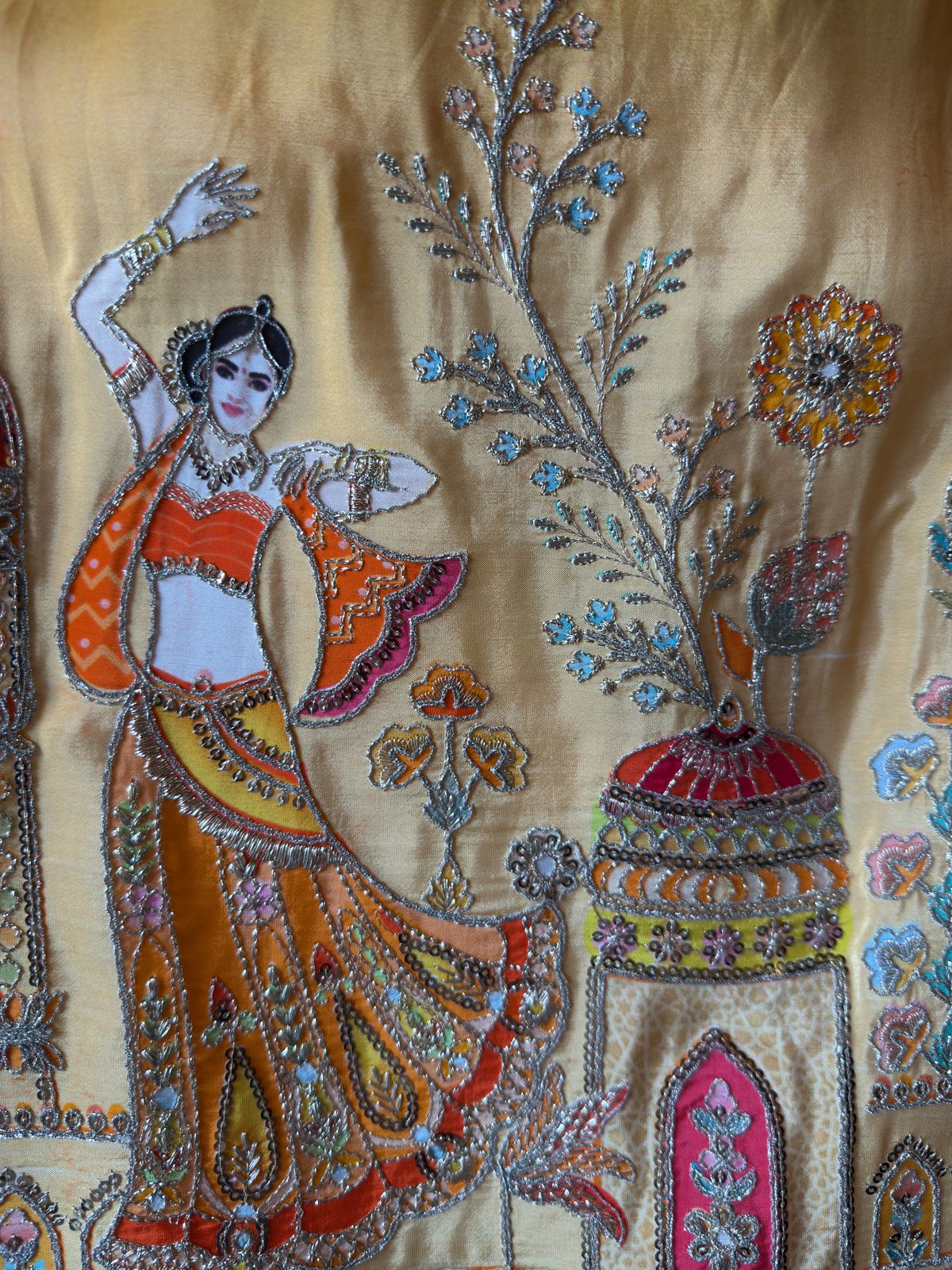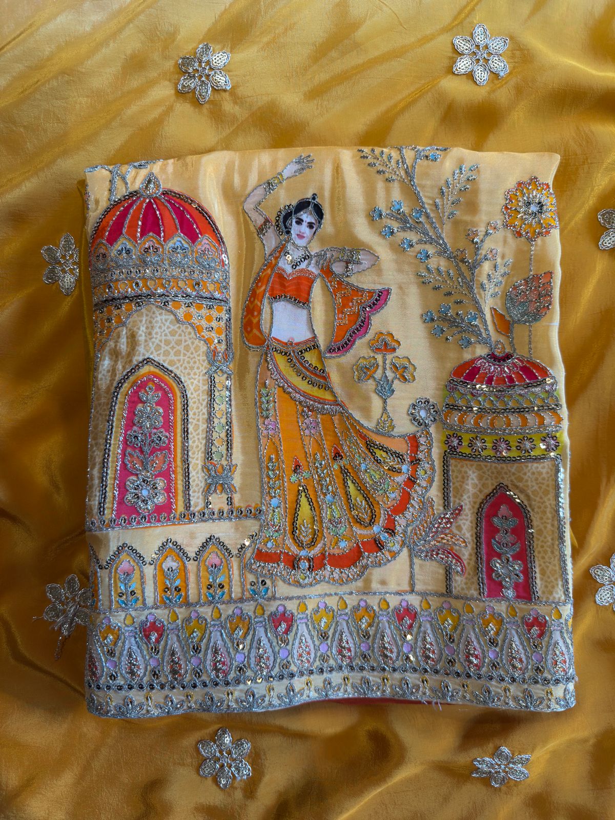 The shirt front is depicting beautiful village art. Depicts a woman in a lehenga-choli dancing, with floral & vine motifs around her.