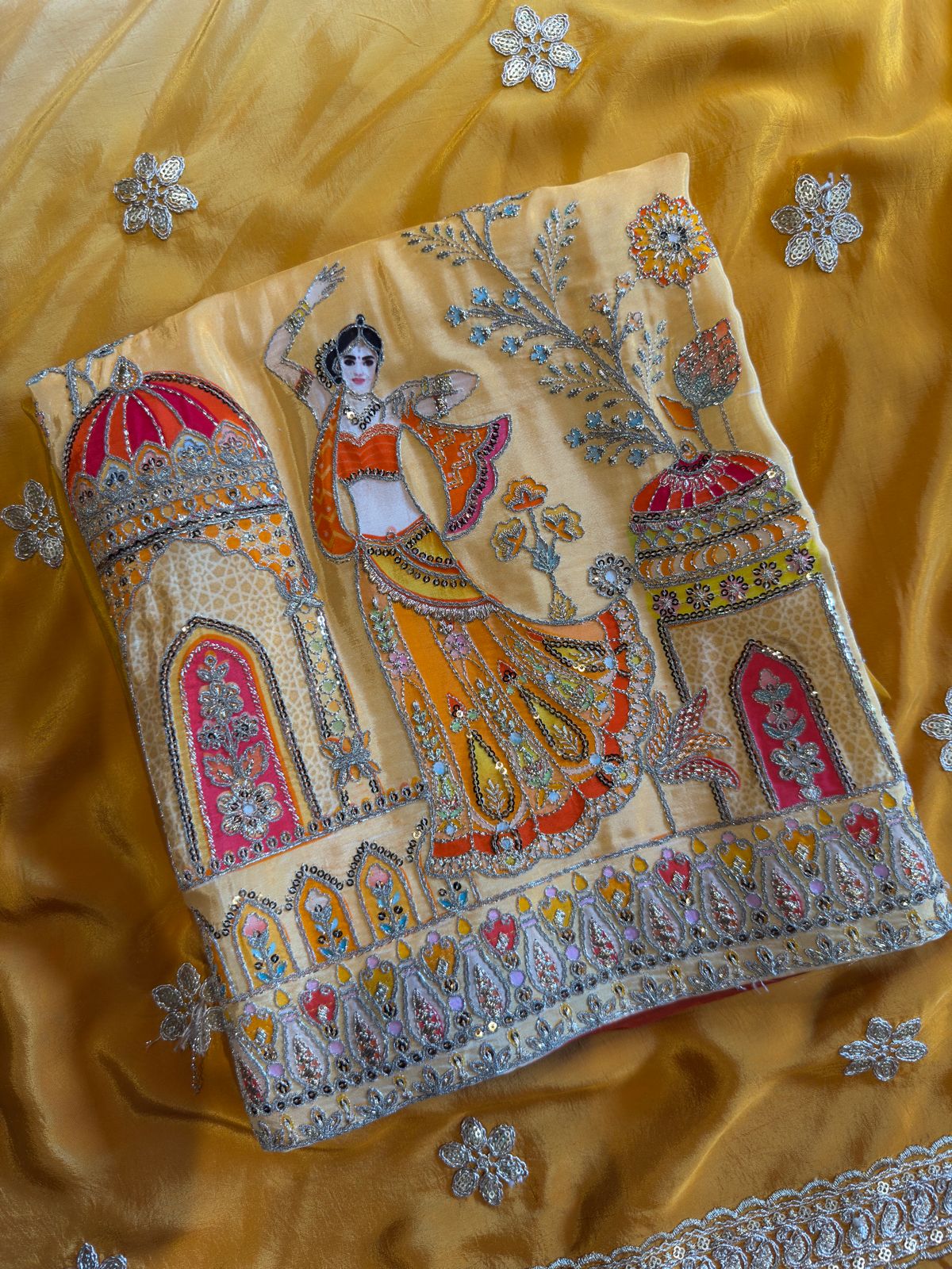 Ombré shaded Pure crepe dupatta with heavily embroidered Zari embellished borders.