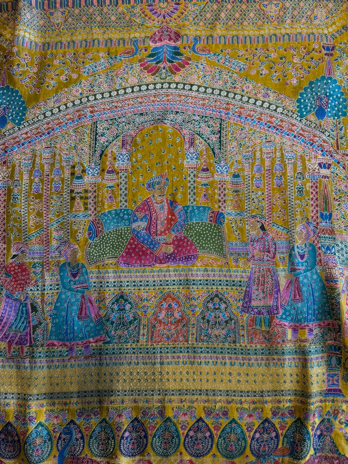 Plain Silk Shirt with Very fine threadwork in tones of pink, gold, black, and green, forming: