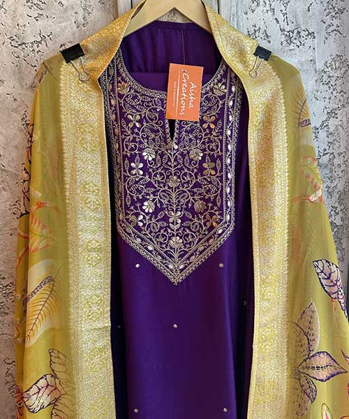 Pure silk unstiched shirt with beautiful bottas all over plus zari dori embroidery on neck