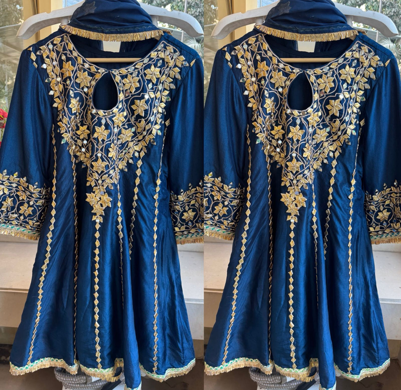 Mirrors are bordered with golden zari and gota patti embroidery.